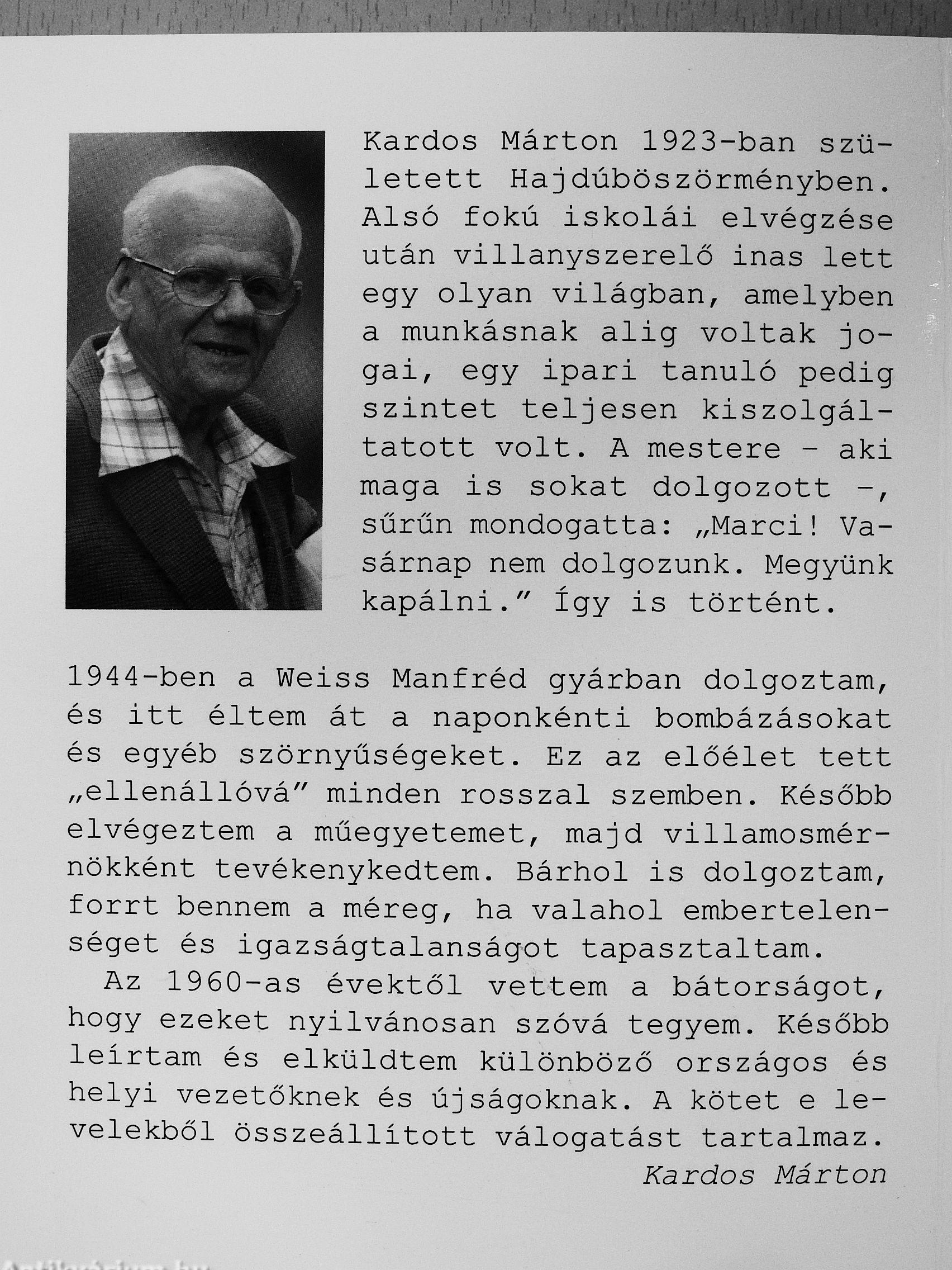Kardos Márton 1923-ban született Hajdúböszörményben. Alsó fokú iskolái elvégzése után villanyszerelő inas lett egy olyan világban, amelyben a munkásnak alig voltak jogai, egy ipari tanuló pedig szintet teljesen kiszolgáltatott volt. A mestere - aki maga is sokat dolgozott sűrűn mondogatta: „Marci! Vasárnap nem dolgozunk. Megyünk kapálni." így is történt.