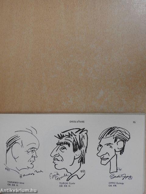 Apropos "torzrajz"! A karikaturának ez a korábbi és alig meghonosodott magyaritott formája nem szerencsés szóalkotás. Hiszen - mint ebben a gyűjteményben is nyilvánvalóan látható - éppen nem torzrajzokat készített Rózsahegyi György, hanem - amint az legfőbb funkciója úgy vélem a karikaturának, - minden hősén megtalálta azt a néhány jellegzetes vonást, amitől a rajz több lett, mint hiteles fénykép, amitől még néha ismeretlen modellről is többet tudunk meg, mintha fényképet kapnánk róla. Ha úgy tetszik, ezeknek a rajzoknak hősei, jobban hasonlítanak önmagukra itt, mint mondjuk egy fényképalbumban. Igy azután, ha szabad ilyen fordulattal élnem, a jó karikaturista esetében, ha felülkerekedik, tehát jól karikkiroz, úgy nemhogy alul nem marad, hanem inkább "megemeli" társát, hősét, szóval, akit megrajzol...