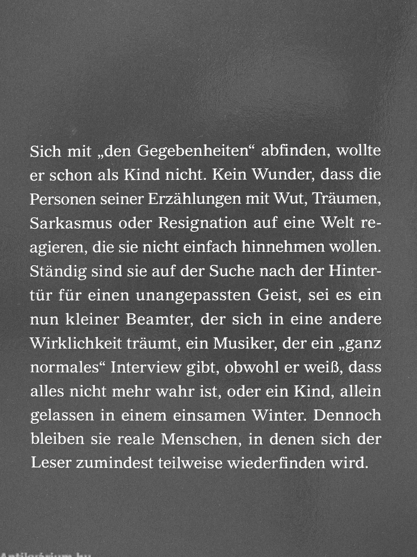 Sich mit „den Gegebenheiten" abfinden, wollte er schon als Kind nicht. Kein Wunder, dass die Personen seiner Erzählungen mit Wut, Träumen, Sarkasmus oder Resignation auf eine Welt reagieren, die sie nicht einfach hinnehmen wollen. Ständig sind sie auf der Suche nach der Hintertür für einen unangepassten Geist, sei es ein nun kleiner Beamter, der sich in eine andere Wirklichkeit träumt, ein Musiker, der ein „ganz normales" Interview gibt, obwohl er weiß, dass alles nicht mehr wahr ist, oder ein Kind, allein gelassen in einem einsamen Winter. Dennoch bleiben sie reale Menschen, in denen sich der Leser zumindest teilweise wiederfinden wird.