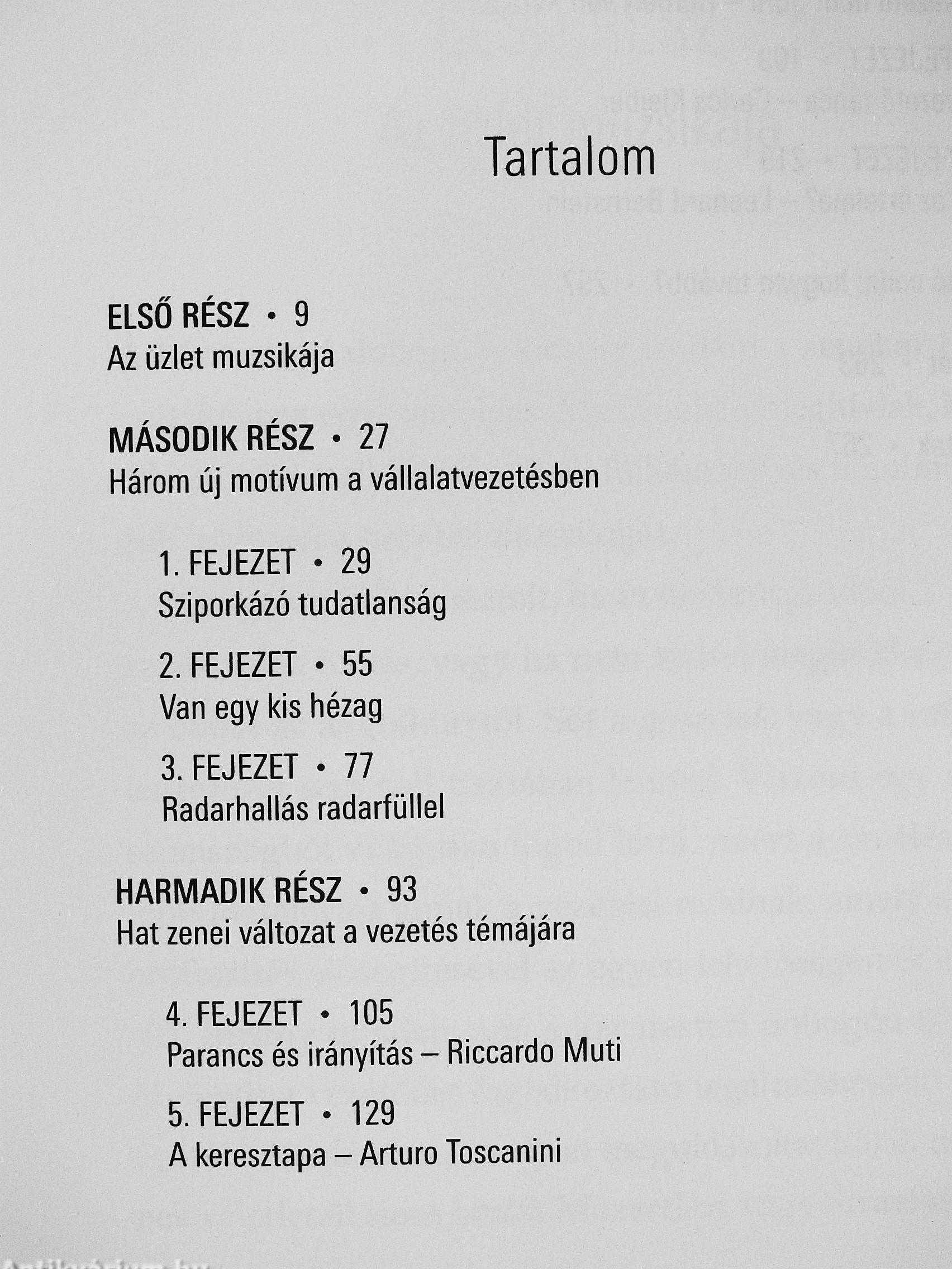 ITAY TALGAM hat világhírű karmester élesen eltérő munkamódszerét elemezve mutatja be a vezetői stílusok apró, de lényeges különbségeit. A parancsokat osztogató Riccardo Muti, az atyáskodó és szenvedélyes Arturo Toscanini, a higgadt Richárd Strauss, a guruként viselkedő Herbert von Karajan, a táncoló Carlos Kleiber és a párbeszéd nagymestere, Leonard Bernstein más-más módon közelít az örök vezetői dilemmához: hogyan lehet összeegyeztetni az irányítást és a kreatív szabadságot - és a kettőt egyidejűleg maximalizálni.