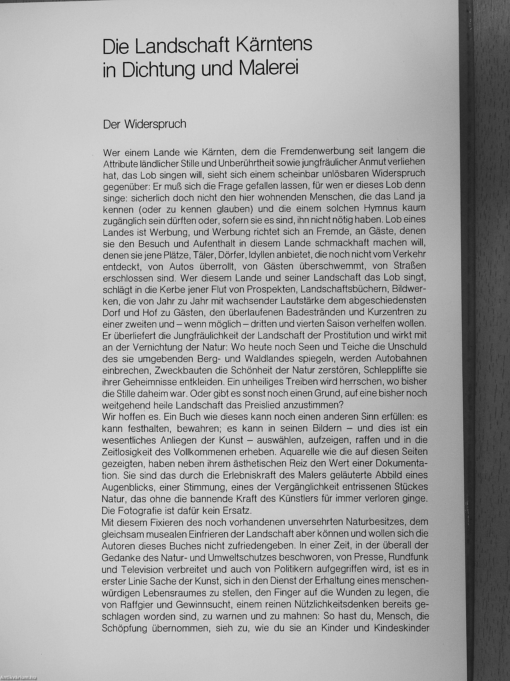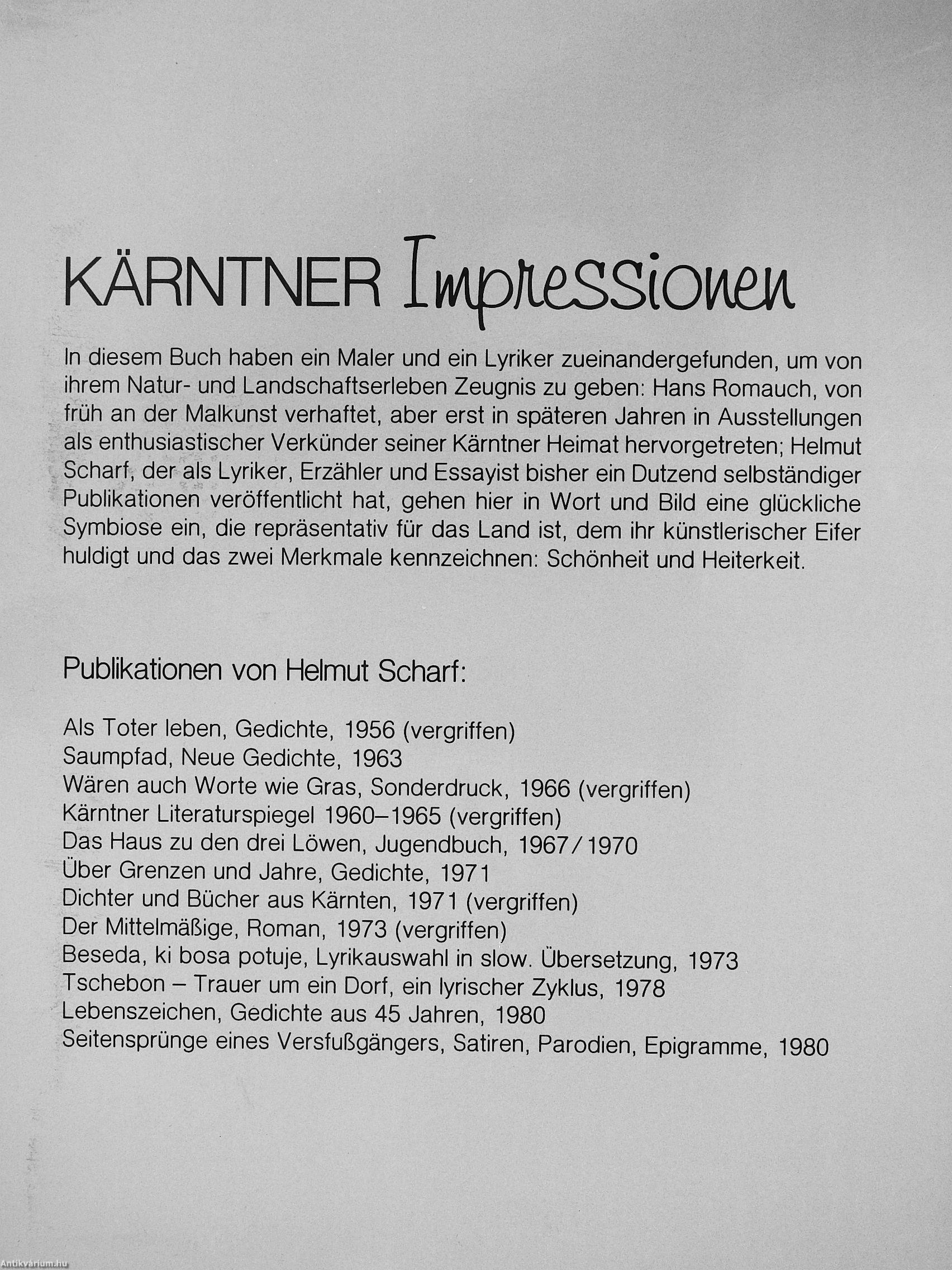 In diesem Buch haben ein Maler und ein Lyriker zueinandergefunden, um von ihrem Natur- und Landschaftserleben Zeugnis zu geben: Hans Romauch, von früh an der Malkunst verhaftet, aber erst in späteren Jahren in Ausstellungen als enthusiastischer Verkünder seiner Kärntner Heimat hervorgetreten; Helmut Scharf, der als Lyriker, Erzähler und Essayist bisher ein Dutzend selbständiger Publikationen veröffentlicht hat, gehen hier in Wort und Bild eine glückliche Symbiose ein, die repräsentativ für das Land ist, dem ihr künstlerischer Eifer huldigt und das zwei Merkmale kennzeichnen: Schönheit und Heiterkeit.