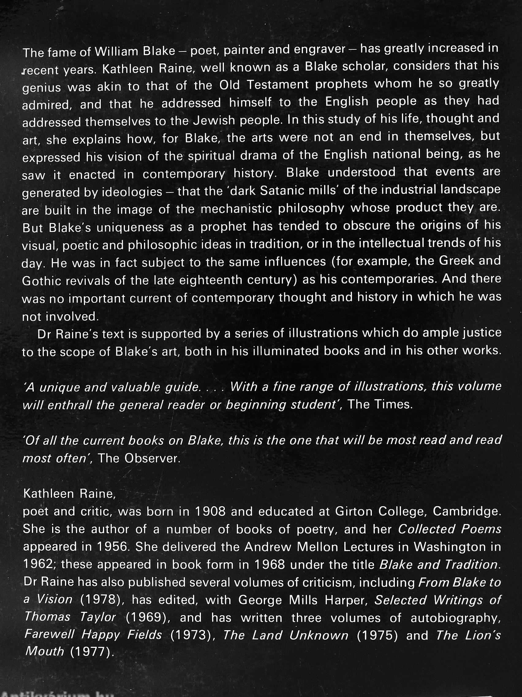 The fame of William Blake - poet, painter and engraver - has greatly increased in j-ecent years. Kathleen Raine, well known as a Blake scholar, considers that his genius was akin to that of the Old Testament prophets whom he so greatly admired, and that he addressed himself to the English people as they had addressed themselves to the Jewish people. In this study of his life, thought and art, she explains how, for Blake, the arts were not an end in themselves, but expressed his vision of the spiritual drama of the English national being, as he saw it enacted in contemporary history. Blake understood that events are generated by ideologies - that the 'dark Satanic mills' of the industrial landscape are built in the image of the mechanistic philosophy whose product they are. But Blake's uniqueness as a prophet has tended to obscure the origins of his visual, poetic and philosophic ideas in tradition, or in the intellectual trends of his day. He was in fact subject to the same influences (for example, the Greek and Gothic revivals of the late eighteenth century) as his contemporaries. And there was no important current of contemporary thought and history in which he was not involved.