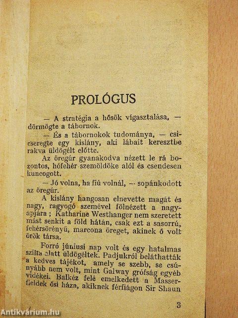 Forró júniusi nap volt és egy hatalmas szilfa alatt üldögéltek. Padjukról beláthatták a kedves tájékot, amely se szebb, se csúnyább nem volt, mint Galway grófság egyéb vidékei. Balkéz felé emelkedett a Masserfieldek ősi háza, akiknek férfiágon Sir shaun Masserfield tábornok, a hírneves stratéga az utolsó ivadéka volt. A házon túl egy jókora földdarab feketéllett, ahol munkások tőzeget ástak és rakásba rakták. Vissza
