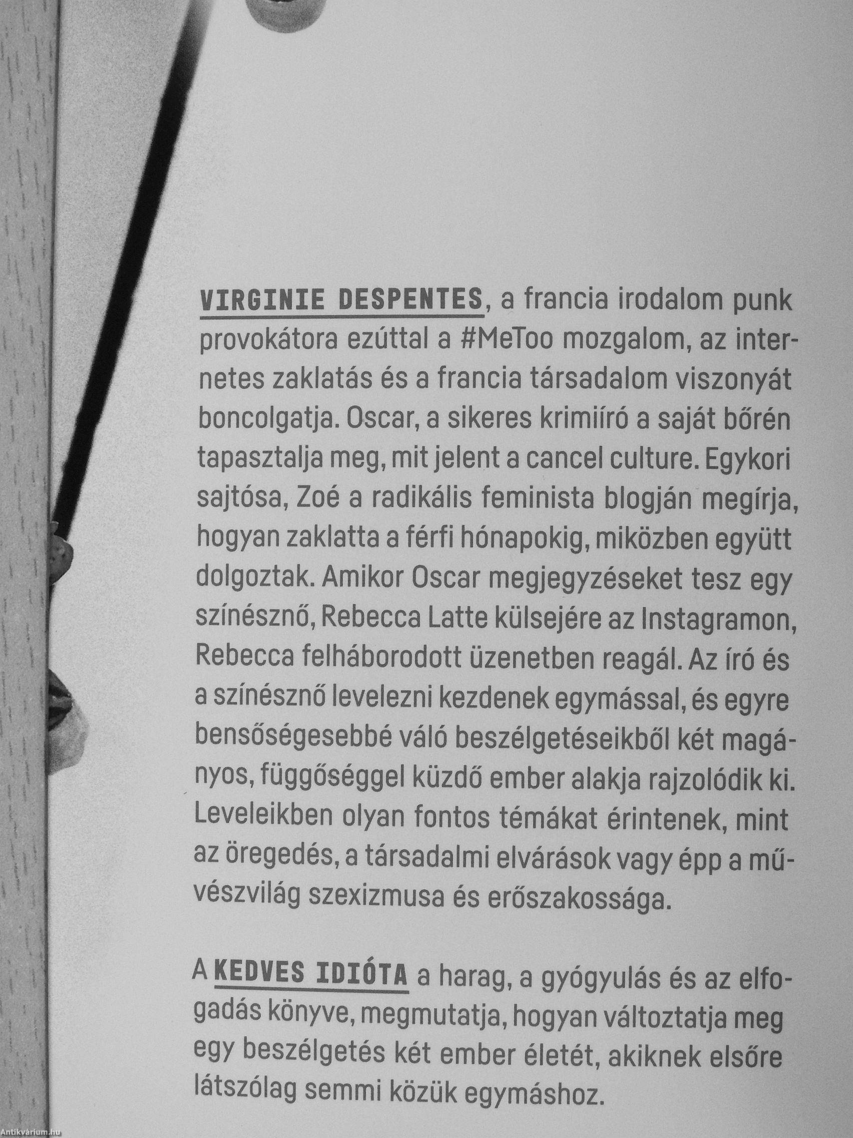 MIR6IHIE DESPEHTES, a francia irodalom punk proN/otótora ezúttal a ttMeToo mozgalom, az internetes zaWatás és a francia társadalom viszonyát bonco\^at\a.Oscar, a sikeres krimiíró a saját bőrén tapasztaVia meg, m\t jelent a cancel culture. Egykori sa\tósa,Zoé a radikális feminista blogján megírja, zaklatta a férfi hónapokig, miközben együtt di0\^0zlak. Emikor Oscar megjegyzéseket tesz egy szmésznö,Rebecca Latte külsejére az Instagramon, Rebecca te\háboroclott üzenetben reagál. Az író és a színésznő \eve\ezn\ kezdenek egymással, és egyre bensőségesebbé váló beszélgetéseikből két magányos, függőséggel küzdő ember alakja rajzolódik ki. \_eve\e\kben olyan fontos témákat érintenek, mint az öTegeőés, a társadalmi elvárások vagy épp a mű-vészvWáQ szexizmusa és erőszakossága.