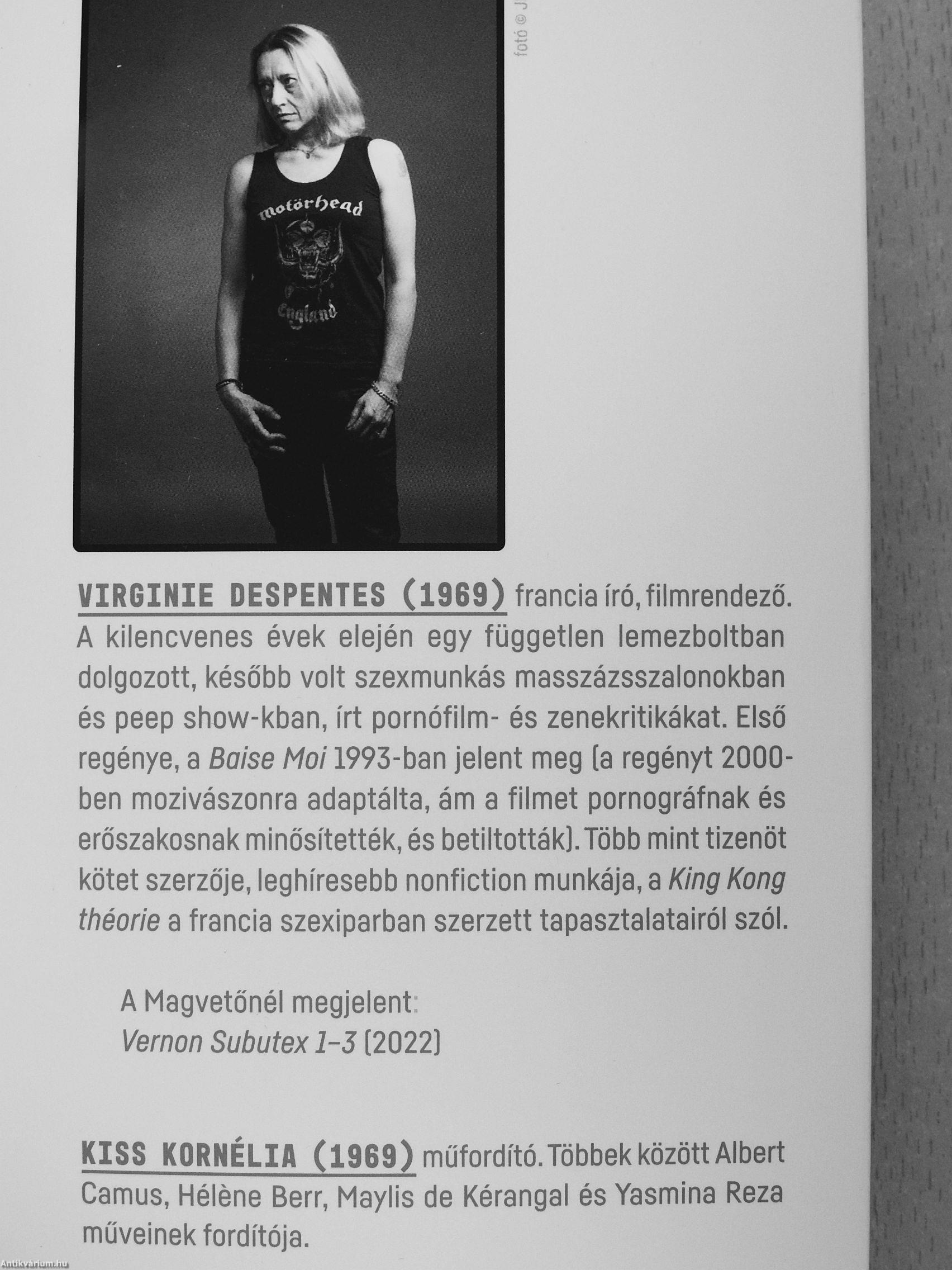 VIRGINIE DESPENTES (1969) francia író,filmrendező. A kilencvenes évek elején egy független lemezboltban dolgozott, később volt szexmunkás masszázsszalonokban és peep show-kban, írt pornófilm- és zenekritikákat. Első regénye, a Baise Moi 1993-ban jelent meg [a regényt 2000-ben mozivászonra adaptálta, ám a filmet pornográfnak és erőszakosnak minősítették, és betiltották).Több mint tizenöt kötet szerzője, leghíresebb nonfiction munkája, a King Kong théorie a francia szexiparban szerzett tapasztalatairól szól.