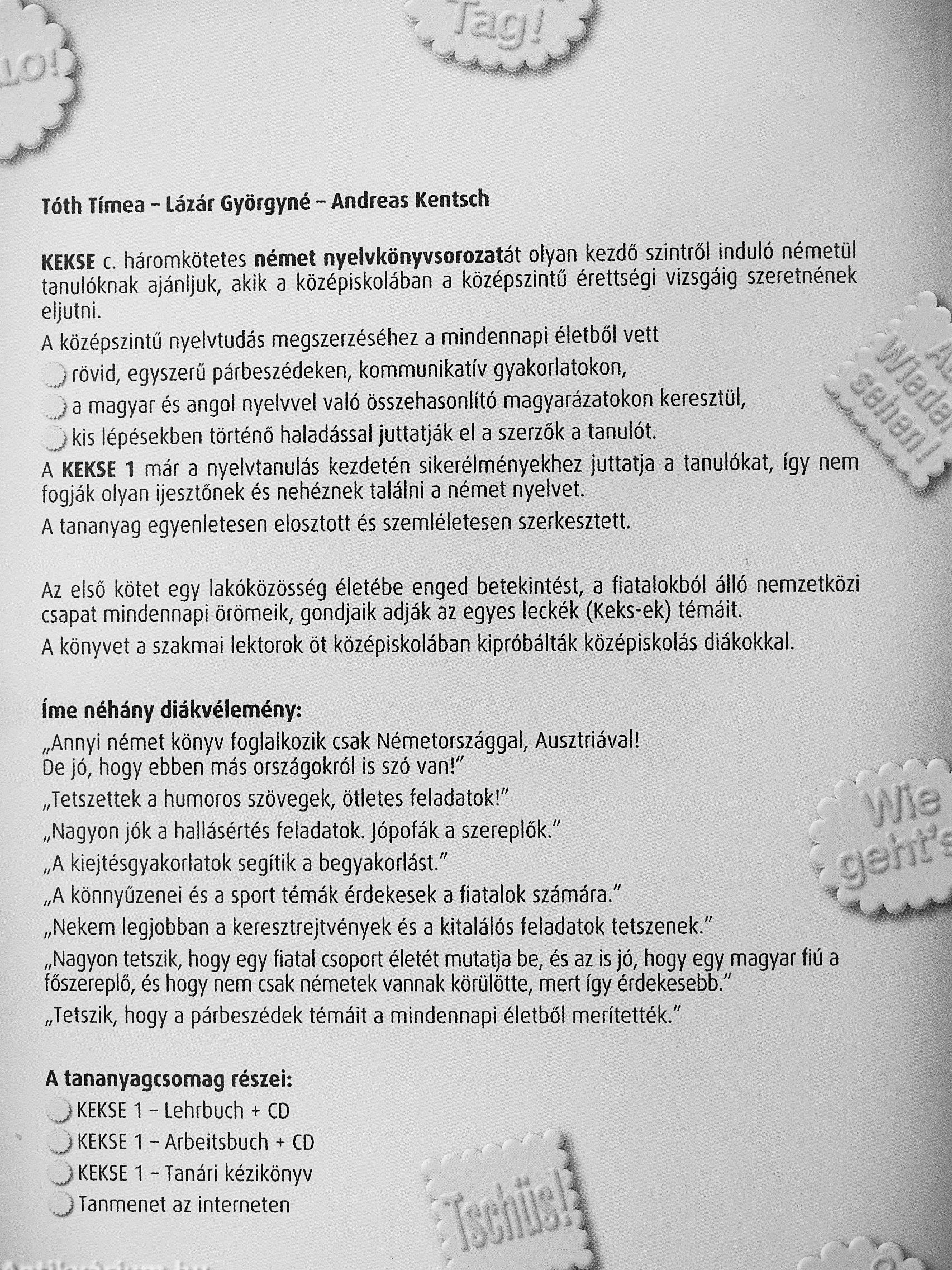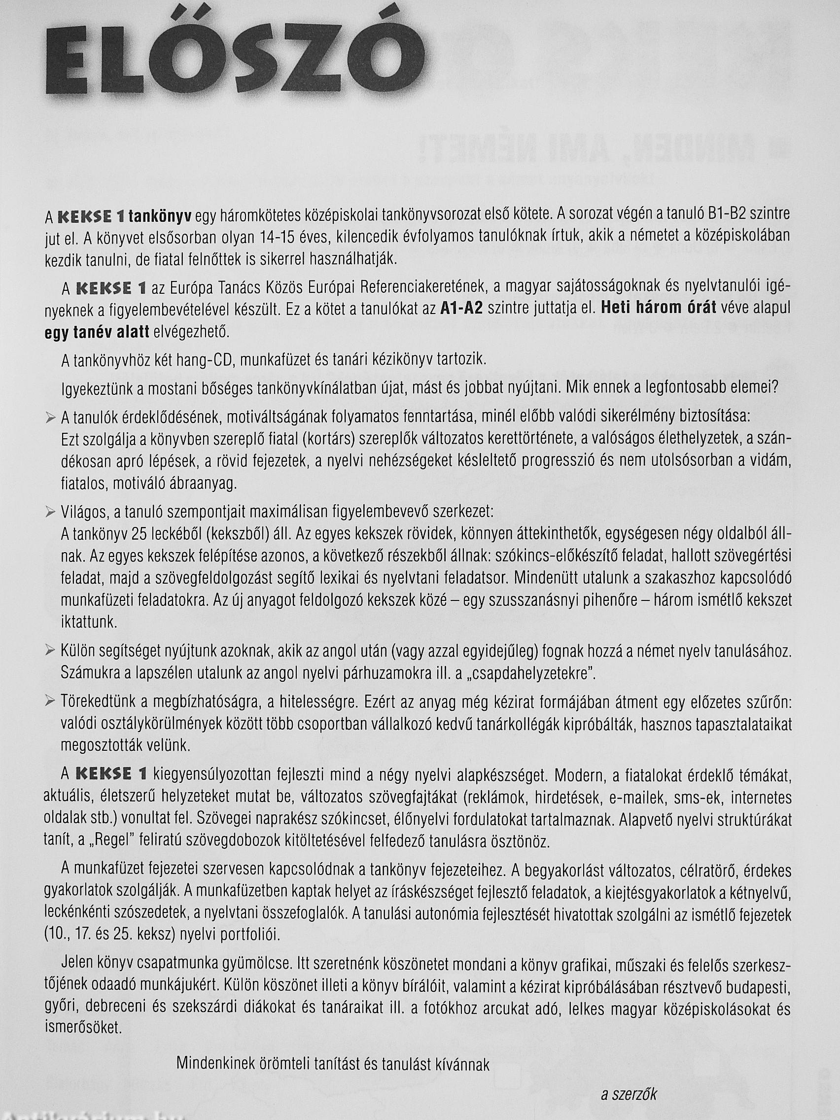 A középszintű nyelvtudás megszerzéséhez a mindennapi életből vett j rövid, egyszerű párbeszédeken, kommunikatív gyakorlatokon, Ja magyar és angol nyelvvel való összehasonlító magyarázatokon keresztül, j kis lépésekben történő haladással juttatják el a szerzők a tanulót. A KEKSE 1 már a nyelvtanulás kezdetén sikerélményekhez juttatja a tanulókat, így nem fogják olyan ijesztőnek és nehéznek találni a német nyelvet. A tananyag egyenletesen elosztott és szemléletesen szerkesztett.