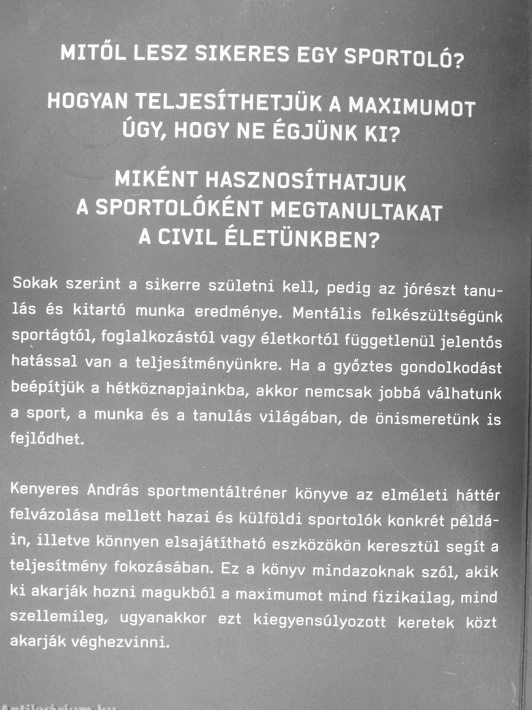 Kenyeres András sportmentáitréner könyve az elméleti háttér felvázolása mellett hazai és külföldi sportolók konkrét példáin, illetve könnyen elsajátítható eszközökön keresztül segít a teljesítmény fokozásában. Ez a könyv mindazoknak szól, akik ki akarják hozni magukból a maximumot mind fizikailag, mind szellemileg, ugyanakkor ezt kiegyensúlyozott keretek közt akarják véghezvinni.