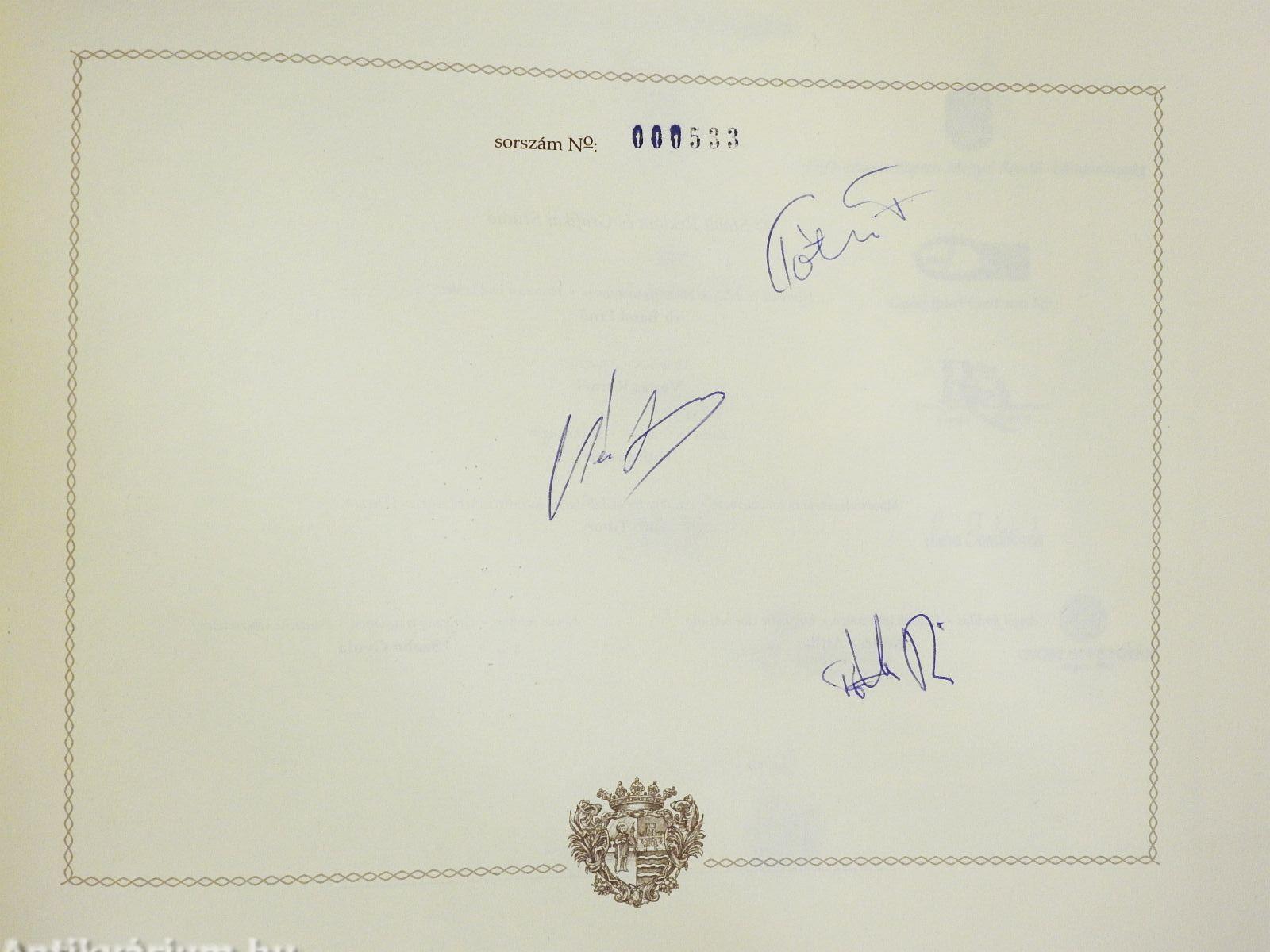 | Megjegyzés: | Tóth Ferenc és Vértes Kornél grafikusok valamint Tóth Tibor kapcsolódó személy által aláírt példány. Fekete-fehér és színes illusztrációkkal. Sorszámozott kiadás. |