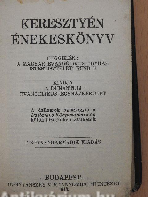 | Megjegyzés: | Negyvenharmadik kiadás. Függelék: A magyar evangélikus egyház istentiszteleti rendje. Nyomtatta Hornyánszky V. R. T. Nyomdai Műintézet, Budapest. |