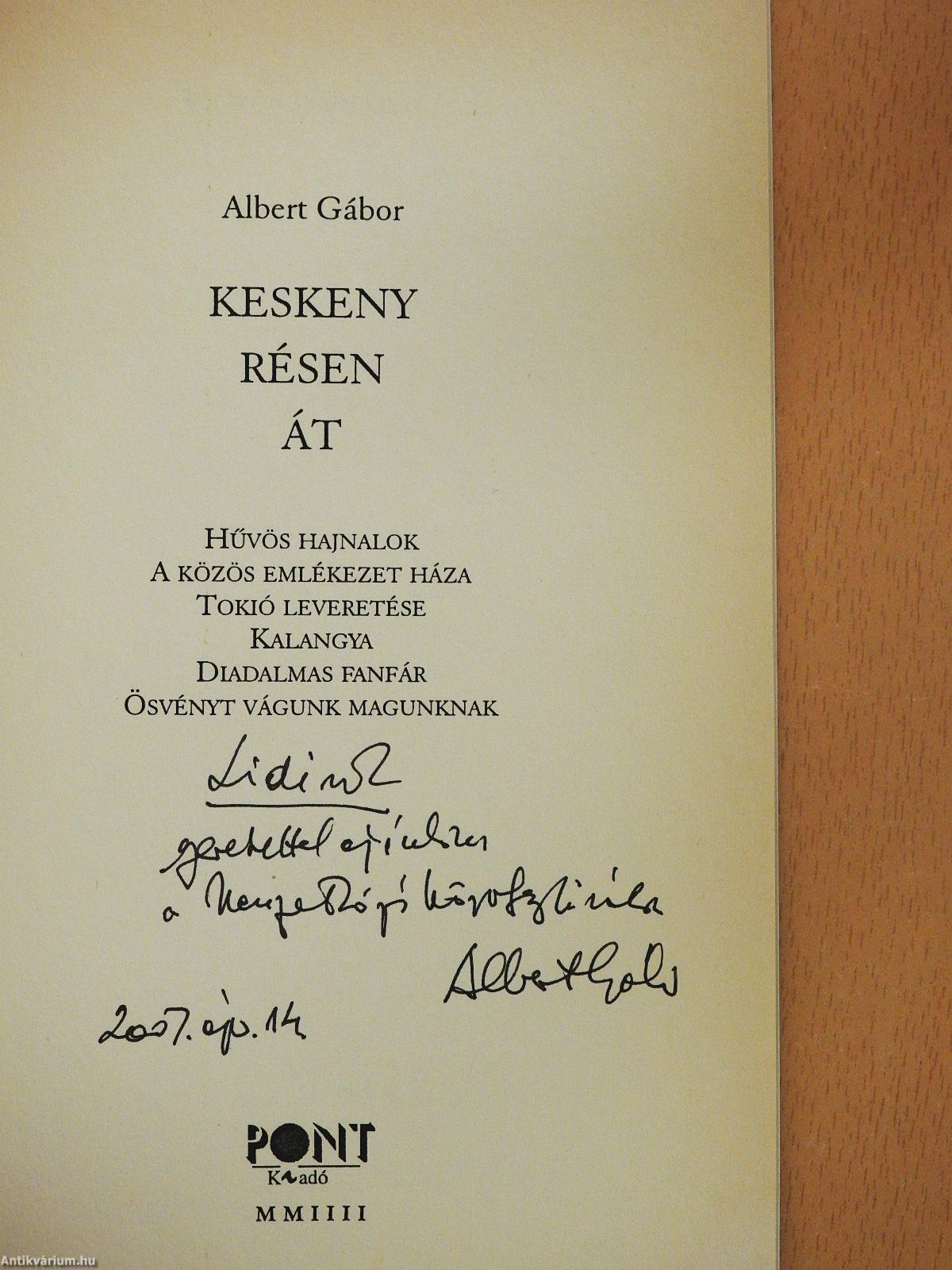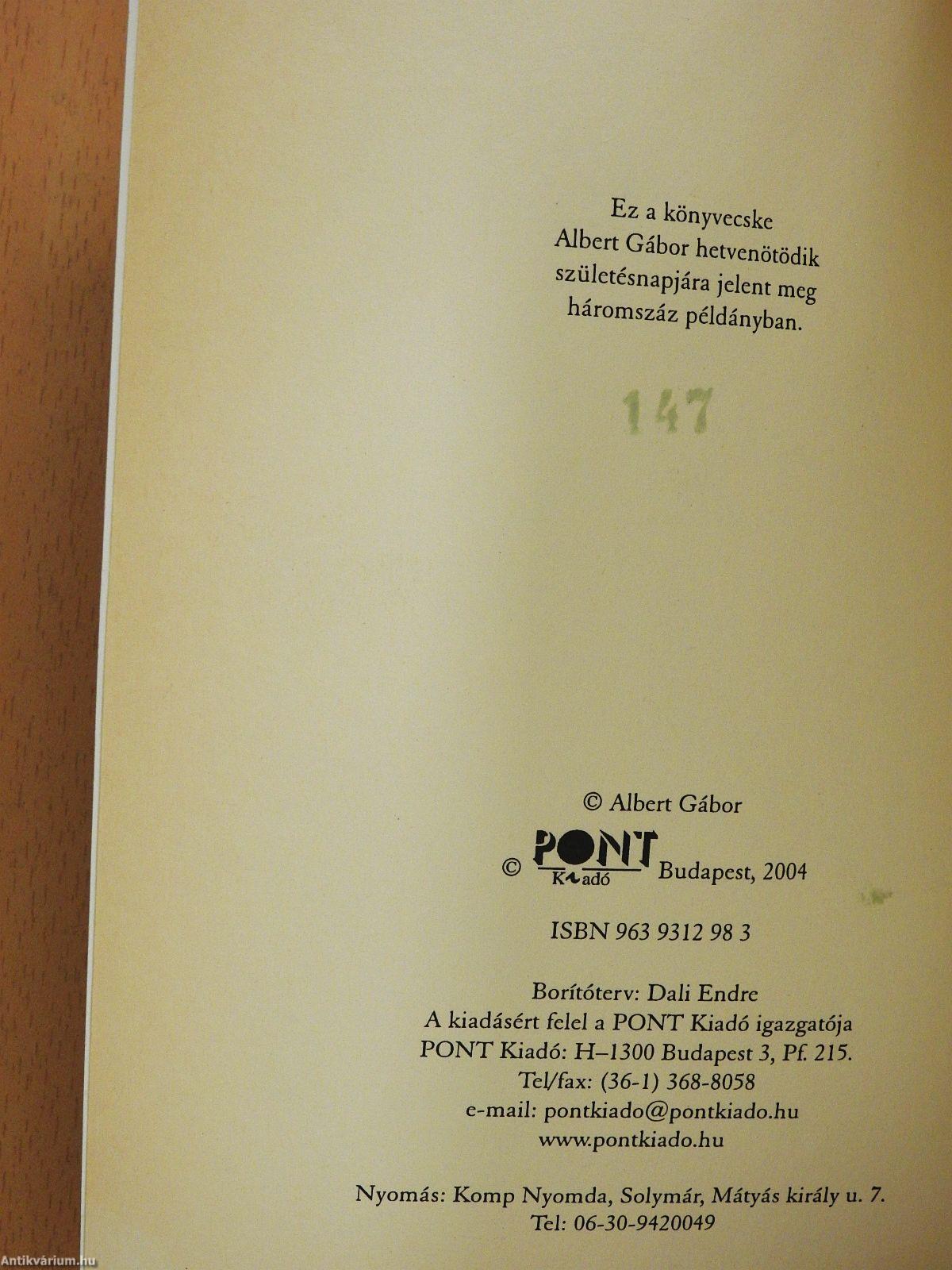 | Megjegyzés: | Albert Gábor szerző által dedikált példány. Ez a könyvecske Albert Gábor hetvenötödik születésnapjára jelent meg háromszáz példányban. Sorszámozott kiadás. |