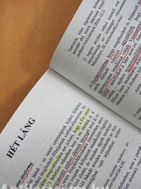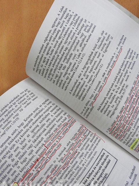 A gerinc elszíneződött, több lapon bejegyzés, színes sorkiemelés, aláhúzás látható.