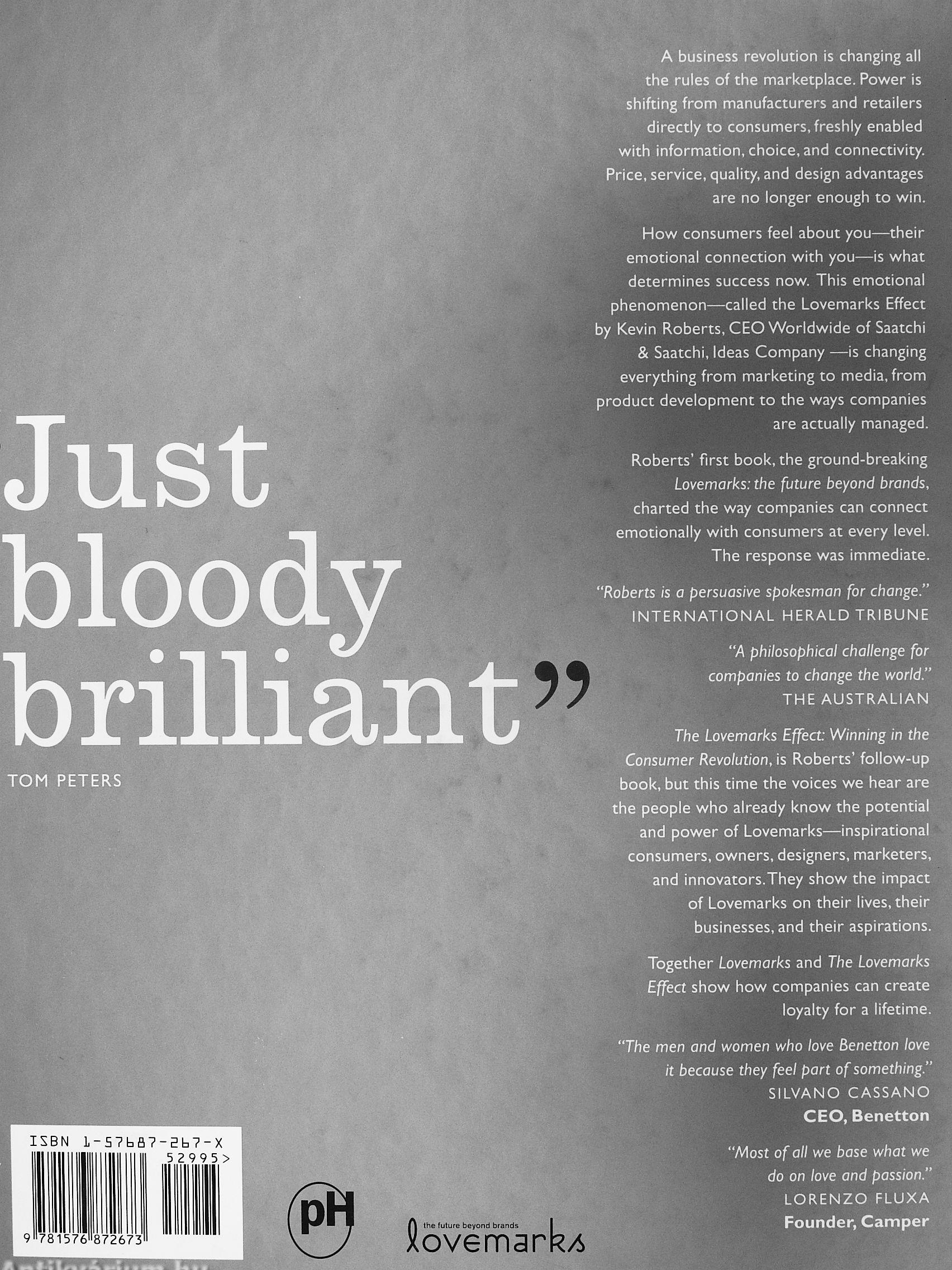 How consumers feel about you—their emotional connection with you—is what determines success now. This emotional phenomenon—called the Lovemarks Effect by Kevin Roberts, CEO Worldwide of Saatchi Saatchi, Ideas Company —is changing everything from marketing to media, from product development to the ways companies are actually managed.