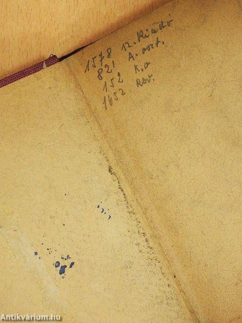 A borító kopott, sarkai sérültek. A borító belső oldal és több lap foltos. Az előzéklapon bejegyzés található.