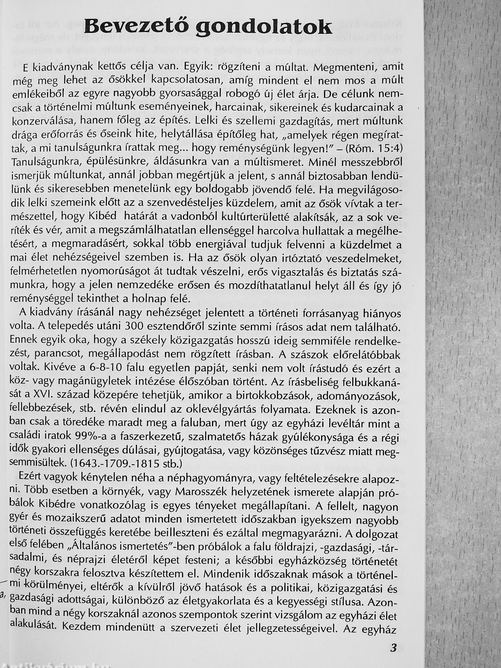 A kiadvány írásánál nagy nehézséget jelentett a történeti forrásanyag hiányos volta. A telepedés utáni 300 esztendőről szinte semmi írásos adat nem található. Ennek egyik oka, hogy a székely közigazgatás hosszú ideig semmiféle rendelkezést, parancsot, megállapodást nem rögzített írásban. A szászok előrelátóbbak voltak. Kivéve a 6-8-10 falu egyetlen papját, senki nem volt írástudó és ezért a köz- vagy magánügyletek intézése élőszóban történt. Az írásbeliség felbukkanását a XVI. század közepére tehetjük, amikor a birtokkobzások, adományozások, fellebbezések, stb. révén elindul az oklevélgyártás folyamata. Ezeknek is azonban csak a töredéke maradt meg a faluban, mert úgy az egyházi levéltár mint a családi iratok 99%-a a faszerkezetű, szalmatetős házak gyúlékonysága és a régi idők gyakori ellenséges dúlásai, gyújtogatása, vagy közönséges tűzvész miatt megsemmisültek.