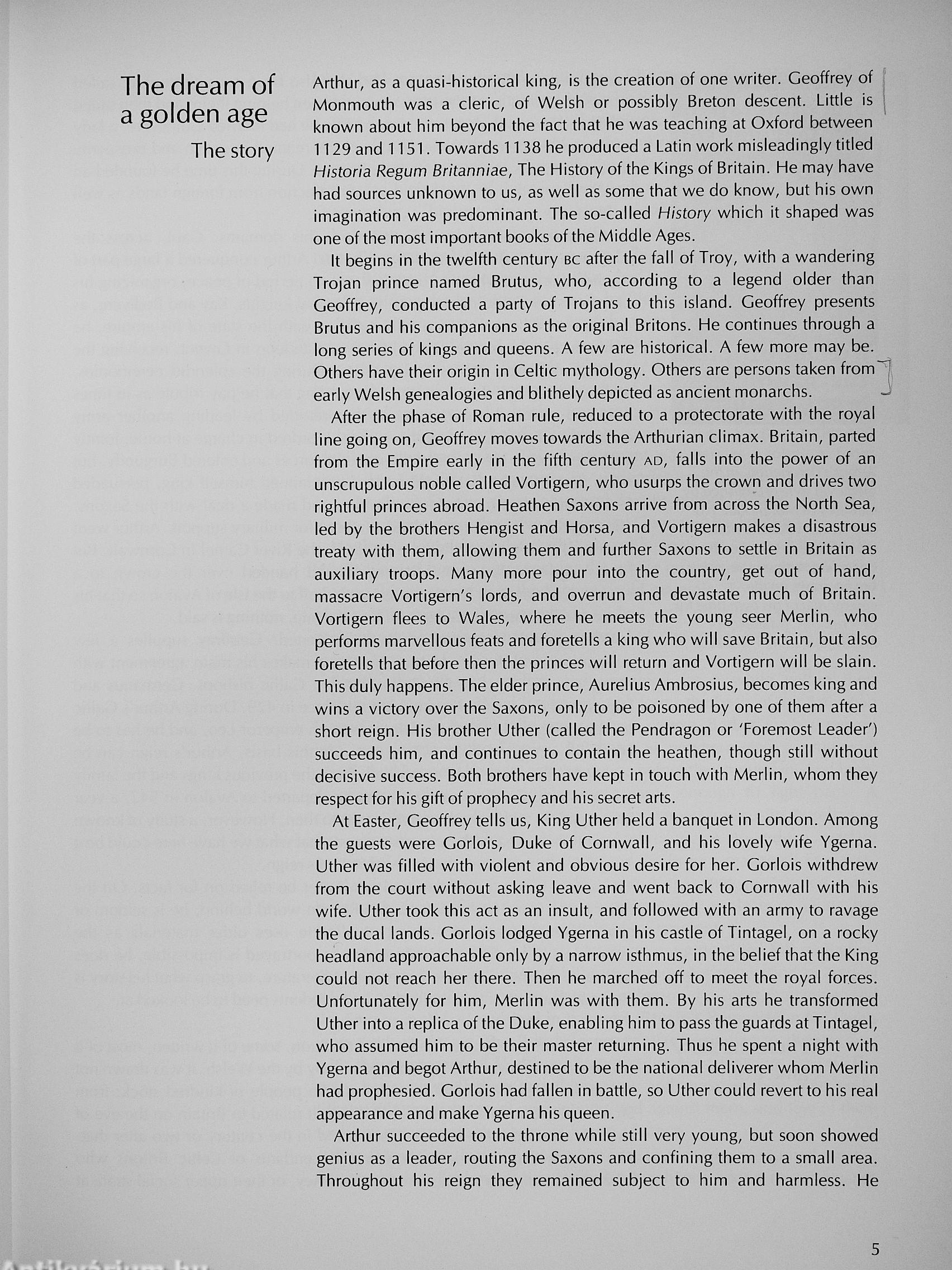 King Arthur is a unique figure, perpetually fascinating yet strangely elusive. He is many-faceted, a topic for specialists in literature and mythology, in archaeology and history; no specialist study has exclusive rights in him, and he transcends them all. For medieval Europe his legend was the greatest single theme of creative writing. But familiar as his medieval image may be, it is not the whole story. His most impressive quality is his power to continue for century after century, fading out and always returning in different guises - as a patriotic leader in Post-Roman Britain, as a larger-than-life hero of Welsh saga, as a king of courtly romance, as a Victorian paragon, as a recurring character in modem fiction, films and children's books. The secret of his vitality lies in his relation to a perennial myth or dream, one that takes a variety of shapes in legend, in religion, even in politics.
