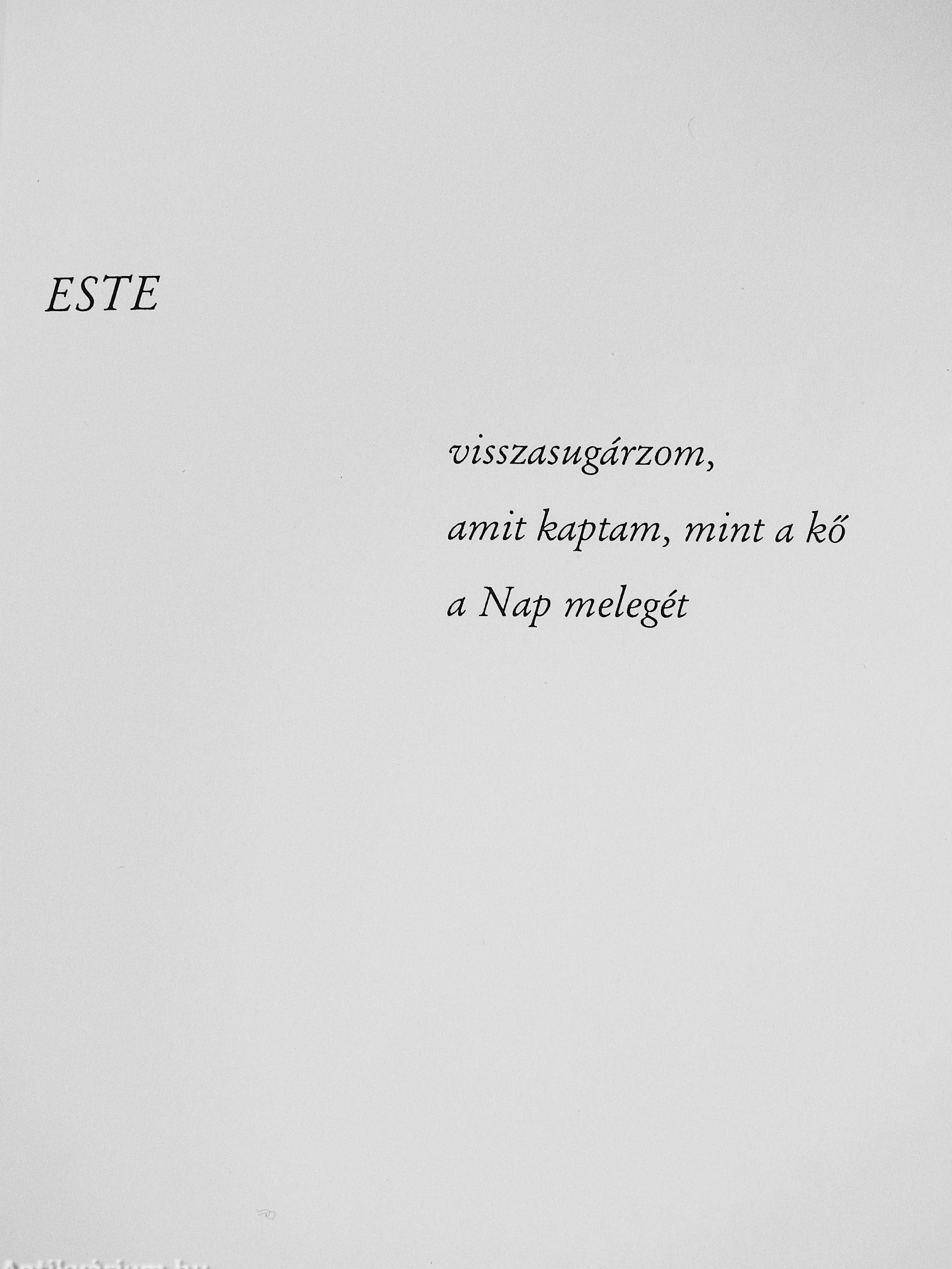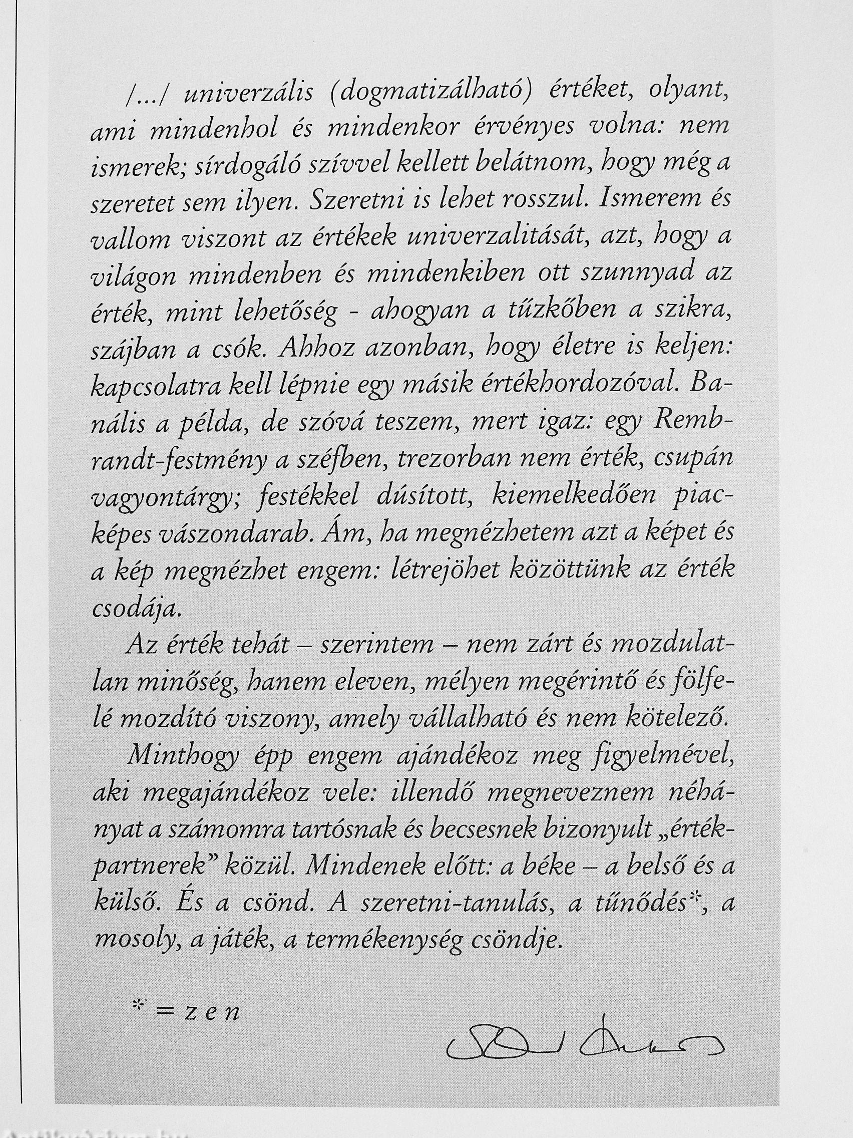 Minthogy épp engem ajándékoz meg figyelmével, aki megajándékoz vele: illendő megneveznem néhányat a számomra tartósnak és becsesnek bizonyult „értékpartnerek'' közül. Mindenek előtt: a béke - a belső és a külső. És a csönd. A szeretni-tanulás, a tűnődés'"', a mosoly, a játék, a termékenység csöndje.