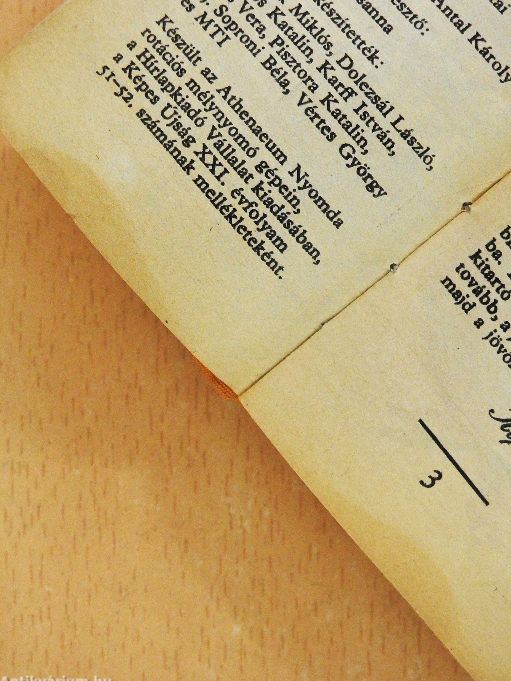 | Megjegyzés: | Nyomda: Athenaeum Nyomda Készült a Képes Újság XXI. évfolyam 51-52. számának mellékleteként. Fekete-fehér és színes fotókkal illusztrálva. A könyv pontos mérete: 54 x 80 mm. |