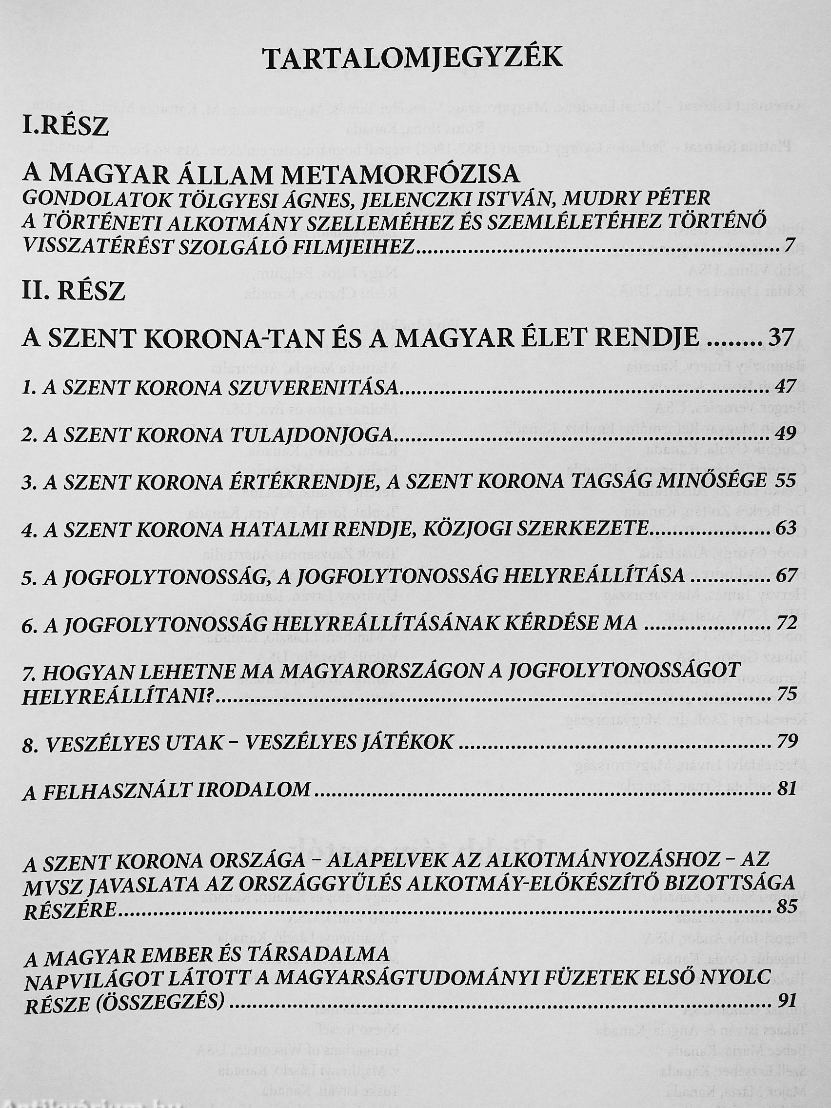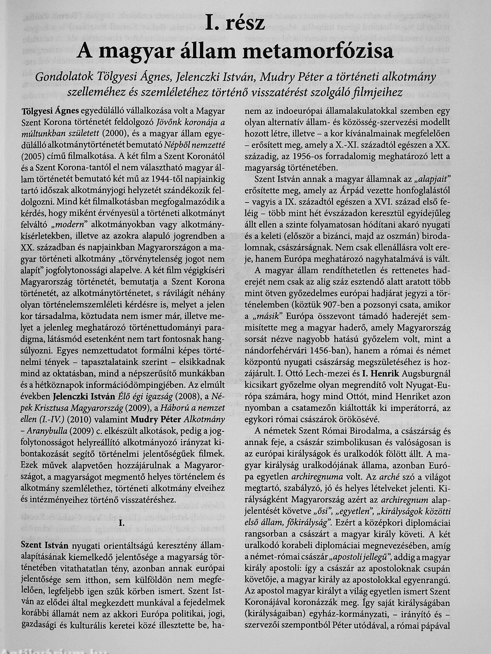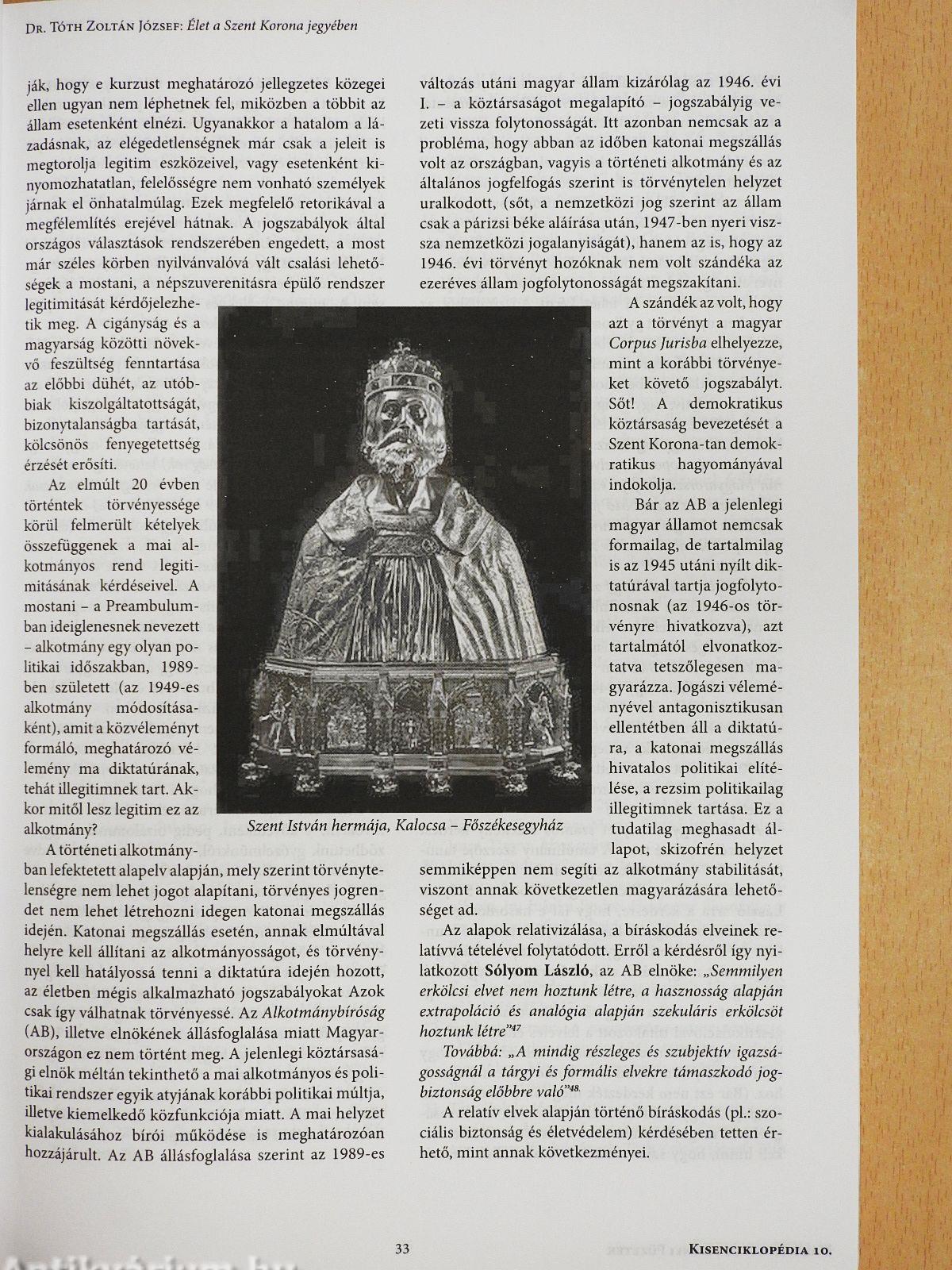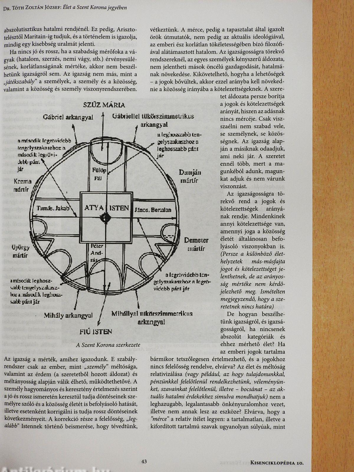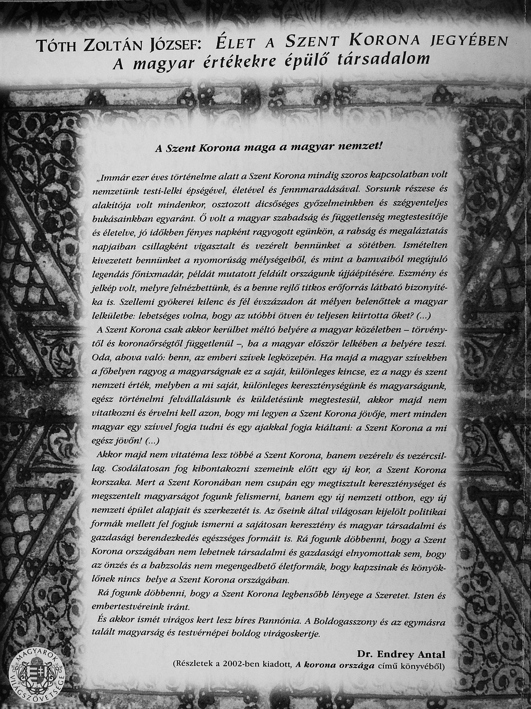 „Immár ezer éves történelme alatt a Szent Korona mindig szoros kapcsolatban volt nemzetünk testi-lelki épségével, életével és fennmaradásával Sorsunk részese és alakítója volt mindenkor, osztozott dicsőséges győzelmeinkben és szégyenteljes bukásainkban egyaránt. Ő volt a magyar szabadság és függetlenség megtestesítője és életelve, jó időkben fényes napként ragyogott egünkön, a rabság és megaláztatás napjaiban csillagként vigasztalt és vezérelt bennünket a sötétben. Ismételten kivezetett bennünket a nyomorúság mélységeiből, és mint a hamvaiból megújuló legendás főnixmadár, példát mutatott feldúlt országunk újjáépítésére. Eszmény és jelkép volt, melyre felnézhettünk, és a benne rejlő titkos erőforrás látható bizonyítéka is. Szellemi gyökerei kilenc és fél évszázadon át mélyen belenőttek a magyar lelkületbe: lehetséges volna, hogy az utóbbi ötven év teljesen...