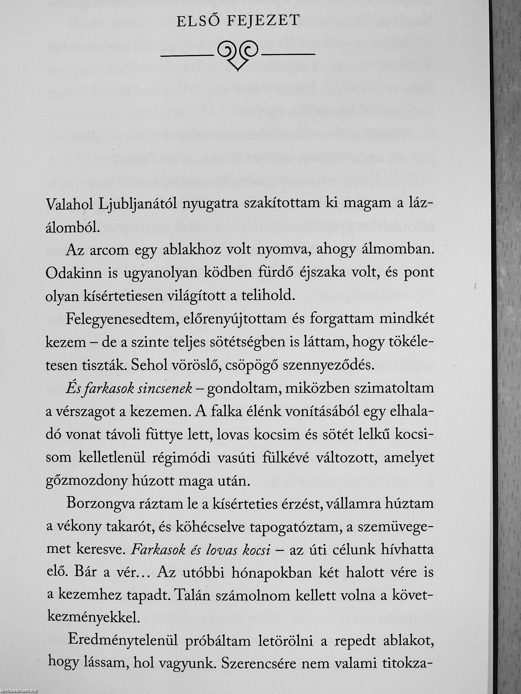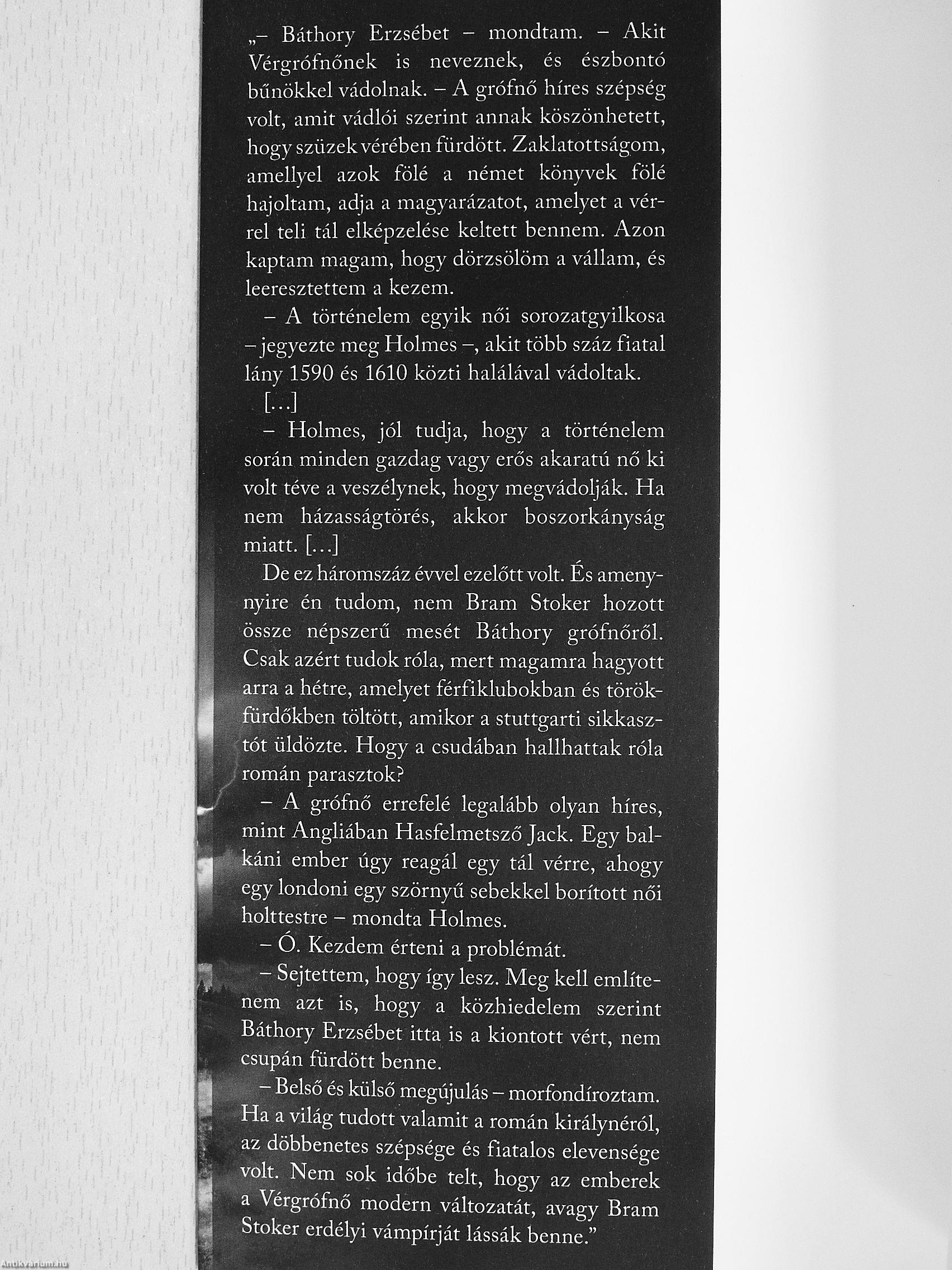 „- Báthory Erzsébet - mondtam. - Akit Vérgrófnőnek is neveznek, és észbontó bűnökkel vádolnak. - A grófnő híres szépség volt, amit vádlói szerint annak köszönhetett, hogy szüzek vérében fürdött. Zaklatottságom, amellyel azok fölé a német könyvek fölé hajoltam, adja a magyarázatot, amelyet a vérrel teli tál elképzelése keltett bennem. Azon kaptam magam, hogy dörzsölöm a vállam, és leeresztettem a kezem.