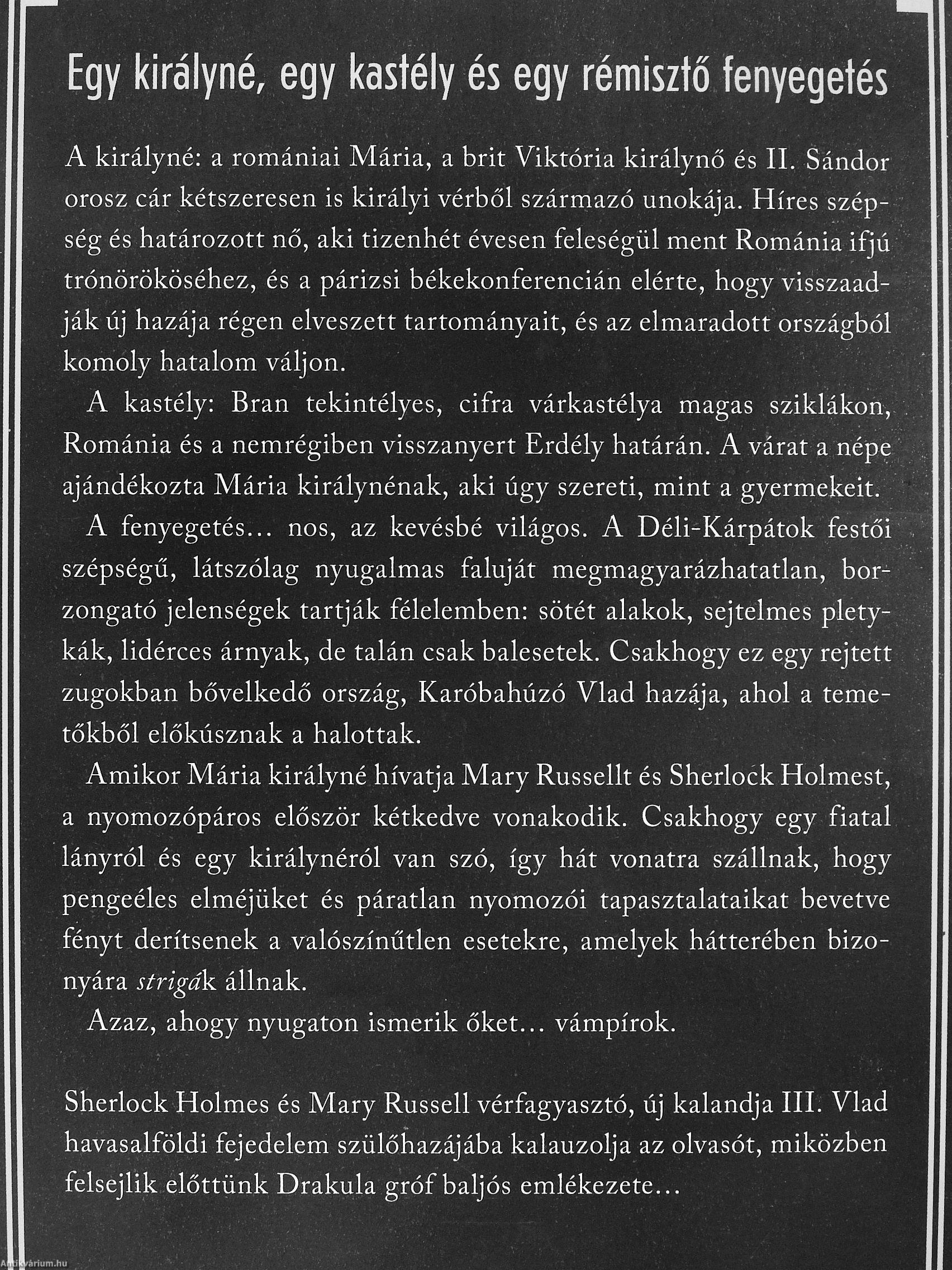 Sherlock Holmes és Mary Russell vérfagyasztó, új kalandja III. Vlad havasalföldi fejedelem szülőhazájába kalauzolja az olvasót, miközben felsejlik előttünk Drakula gróf baljós emlékezete