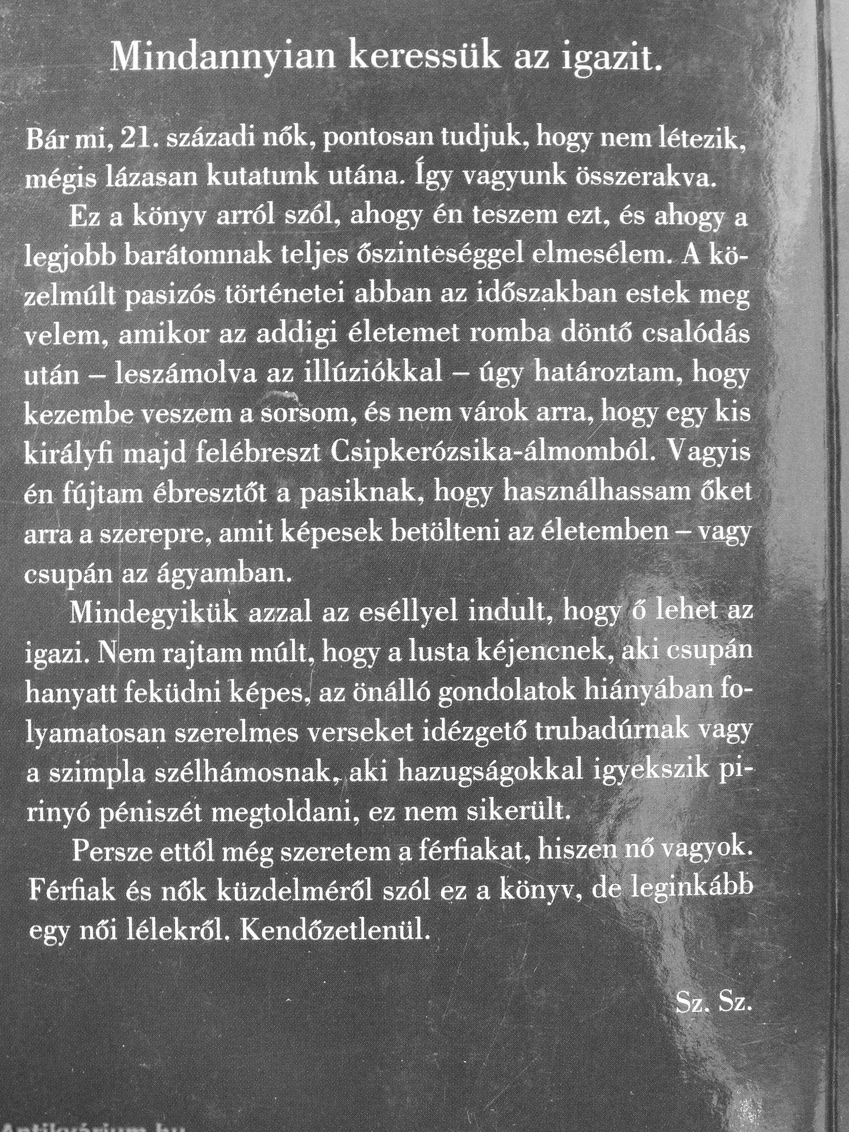 Mindegyikük azzal az eséllyel indult, hogy ő lehet az igazi. Nem rajtam múlt, hogy a lusta kéjencnek, aki csupán hanyatt feküdni képes,' az önálló gondolatok hiányában folyamatosan szerelmes verseket idézgető trubadúrnak vagy a szimpla szélhámosnak,, aki hazugságokkal igyekszik pirinyó péniszét megtoldani, ez nem... Tovább