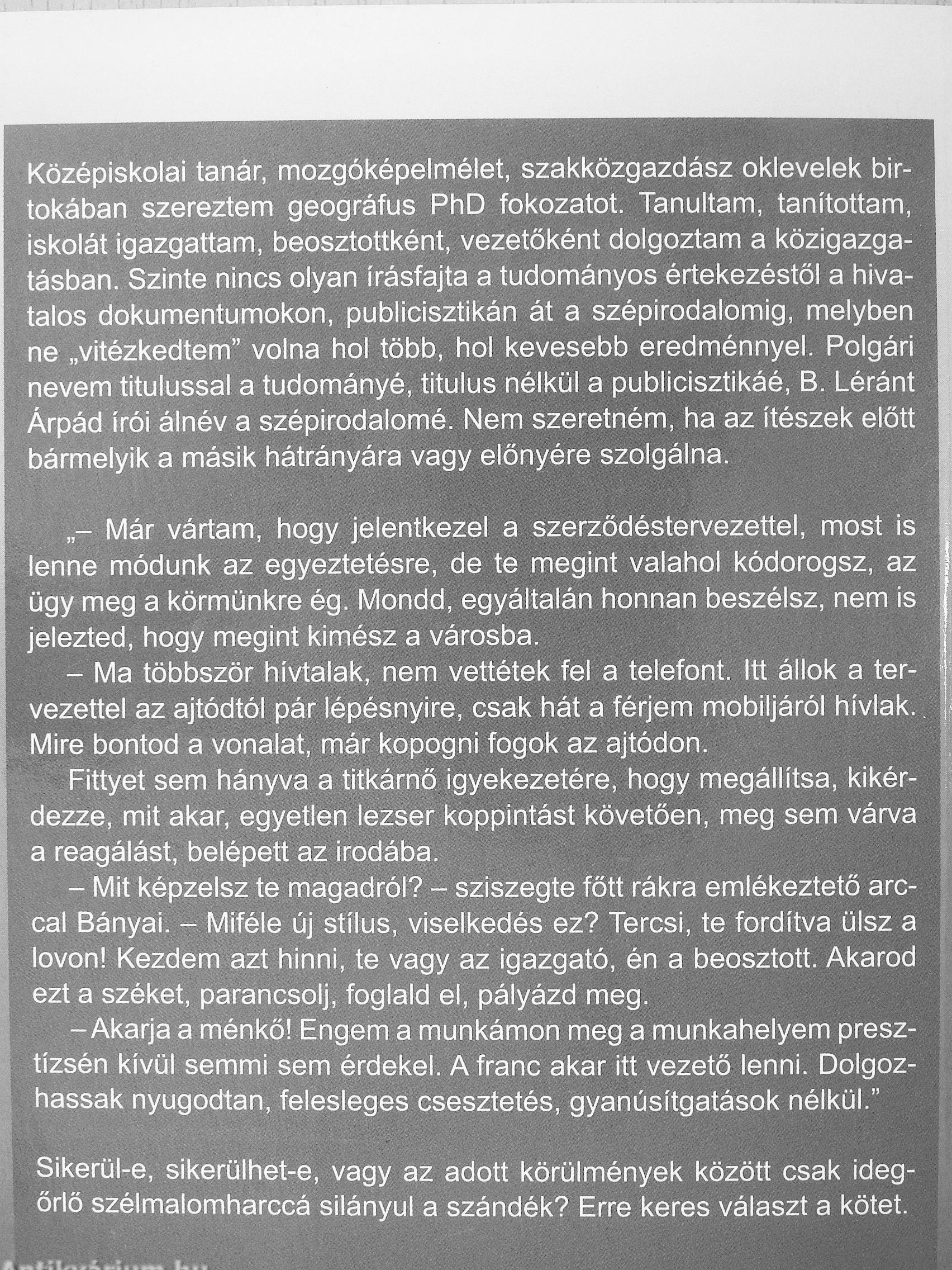 Középiskolai tanár, mozgóképelmélet, szakközgazdász oklevelek birtokában szereztem geográfus PhD fokozatot. Tanultam, tanítottam, iskolát igazgattam, beosztottként, vezetőként dolgoztam a közigazgatásban. Szinte nincs olyan írásfajta a tudományos értekezéstől a hivatalos dokumentumokon, publicisztikán át a szépirodalomig, melyben ne „vitézkedtem" volna hol több, hol kevesebb eredménnyel. Polgári nevem titulussal a tudományé, titulus nélkül a publicisztikáé, B. Léránt Árpád írói álnév a szépirodalomé. Nem szeretném, ha az ítészek előtt bármelyik a másik hátrányára vagy előnyére szolgálna.