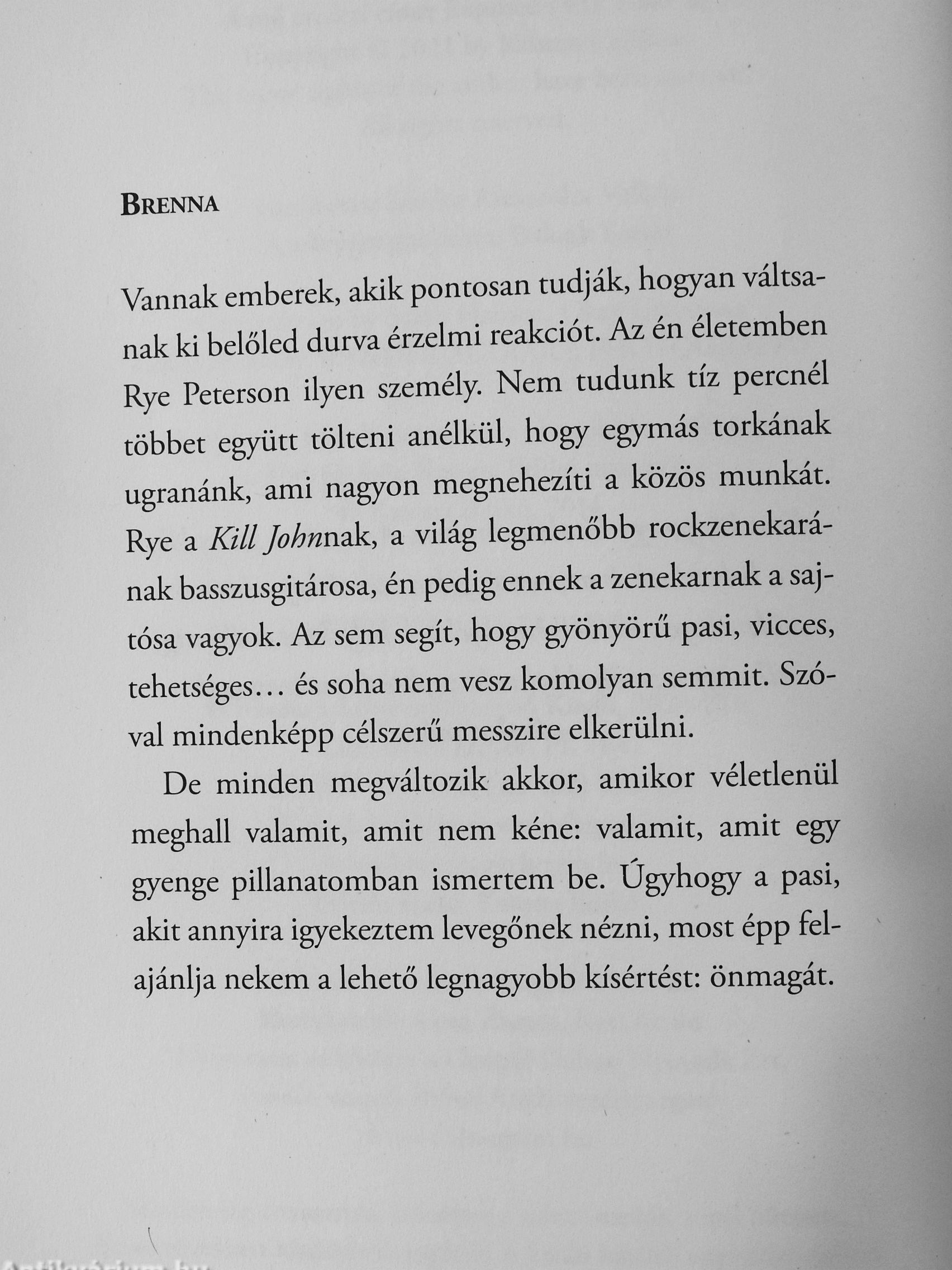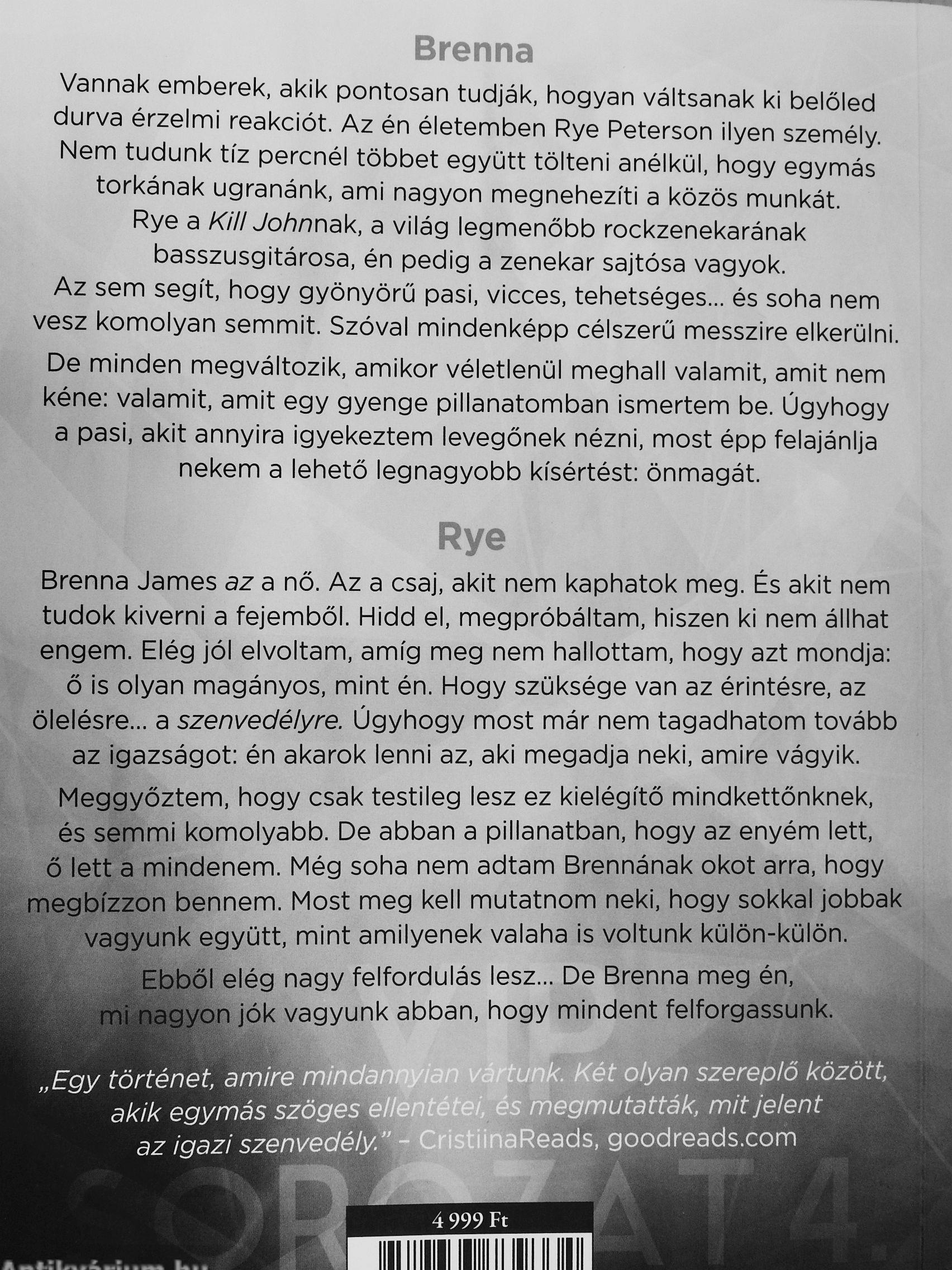 Vannak emberek, akik pontosan tudják, hogyan váltsanak ki belőled durva érzelmi reakciót. Az én életemben Rye Peterson ilyen személy. Nem tudunk tíz percnél többet együtt tölteni anélkül, hogy egymás torkának ugranánk, ami nagyon megnehezíti a közös munkát. Rye a KiH Johnuak, a világ legmenőbb rockzenekarának basszusgitárosa, én pedig a zenekar sajtósa vagyok. Az sem segít, hogy gyönyörű pasi, vicces, tehetséges és soha nem vesz komolyan semmit. Szóval mindenképp célszerű messzire elkerülni. De minden megváltozik, amikor véletlenül meghall valamit, amit nem kéne: valamit, amit egy gyenge pillanatomban ismertem be. Úgyhogy a pasi, akit annyira igyekeztem levegőnek nézni, most épp felajánlja nekem a lehető legnagyobb kísértést: önmagát.