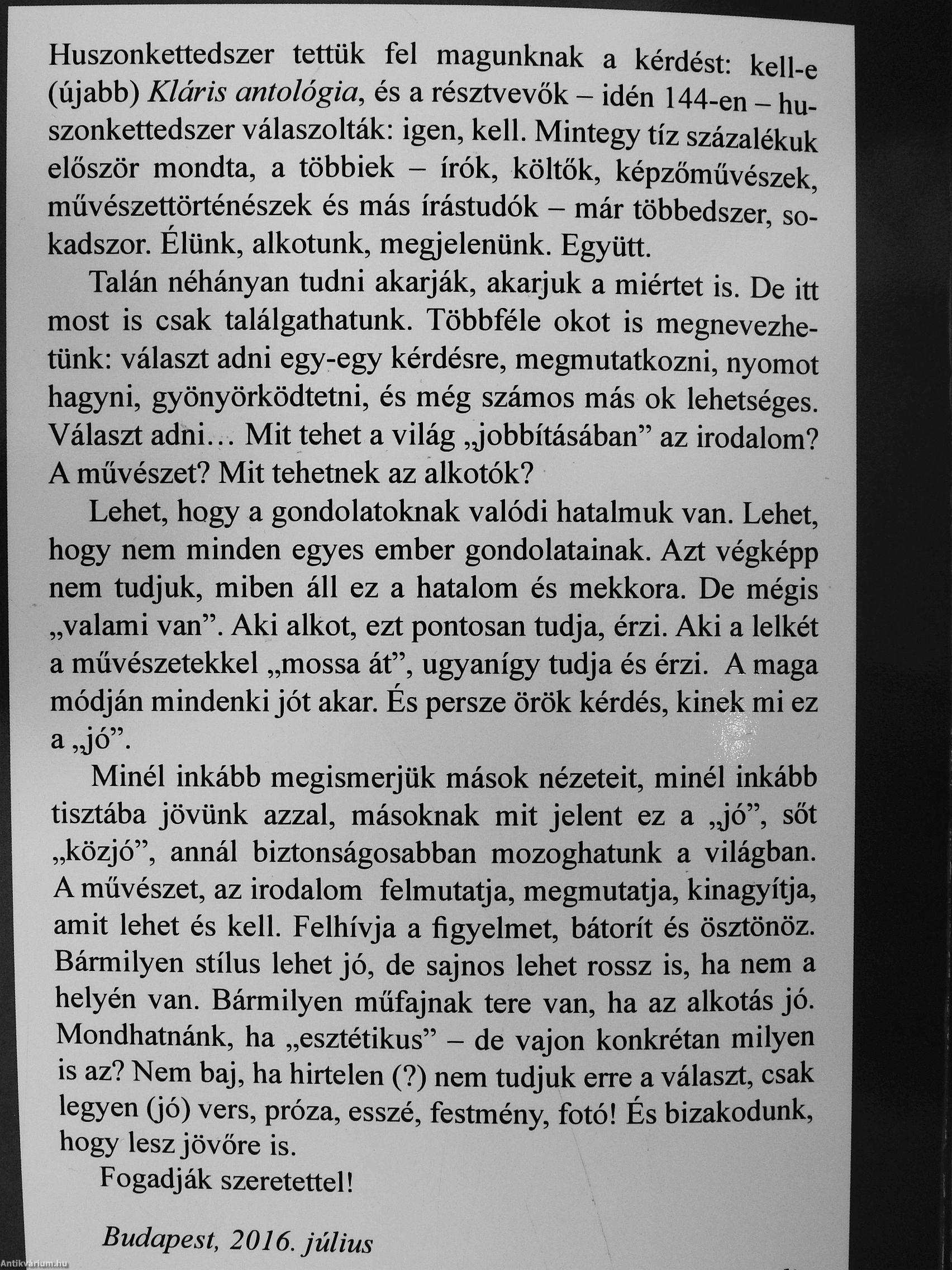 Huszonkettedszer tettük fel magunknak a kérdést: kell-e (újabb) Kláris antológia, és a résztvevők - idén 144-en - huszonkettedszer válaszolták: igen, kell. Mintegy tíz százalékuk először mondta, a többiek - írók, költők, képzőművészek, művészettörténészek és más írástudók - már többedszer, sokadszor. Élünk, alkotunk, megjelenünk. Együtt.