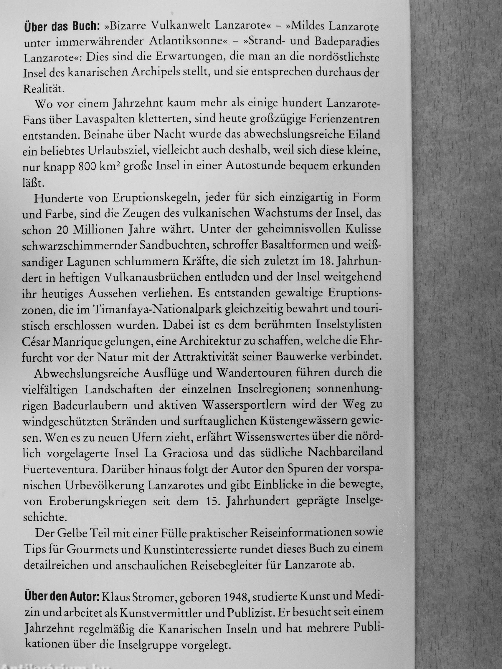 Über den Autor: Klaus Stromer, geboren 1948, studierte Kunst und Medizin und arbeitet als Kunstvermittler und Publizist. Er besucht seit einem Jahrzehnt regelmäßig die Kanarischen Inseln und hat mehrere Publikationen über die Inselgruppe vorgelegt.