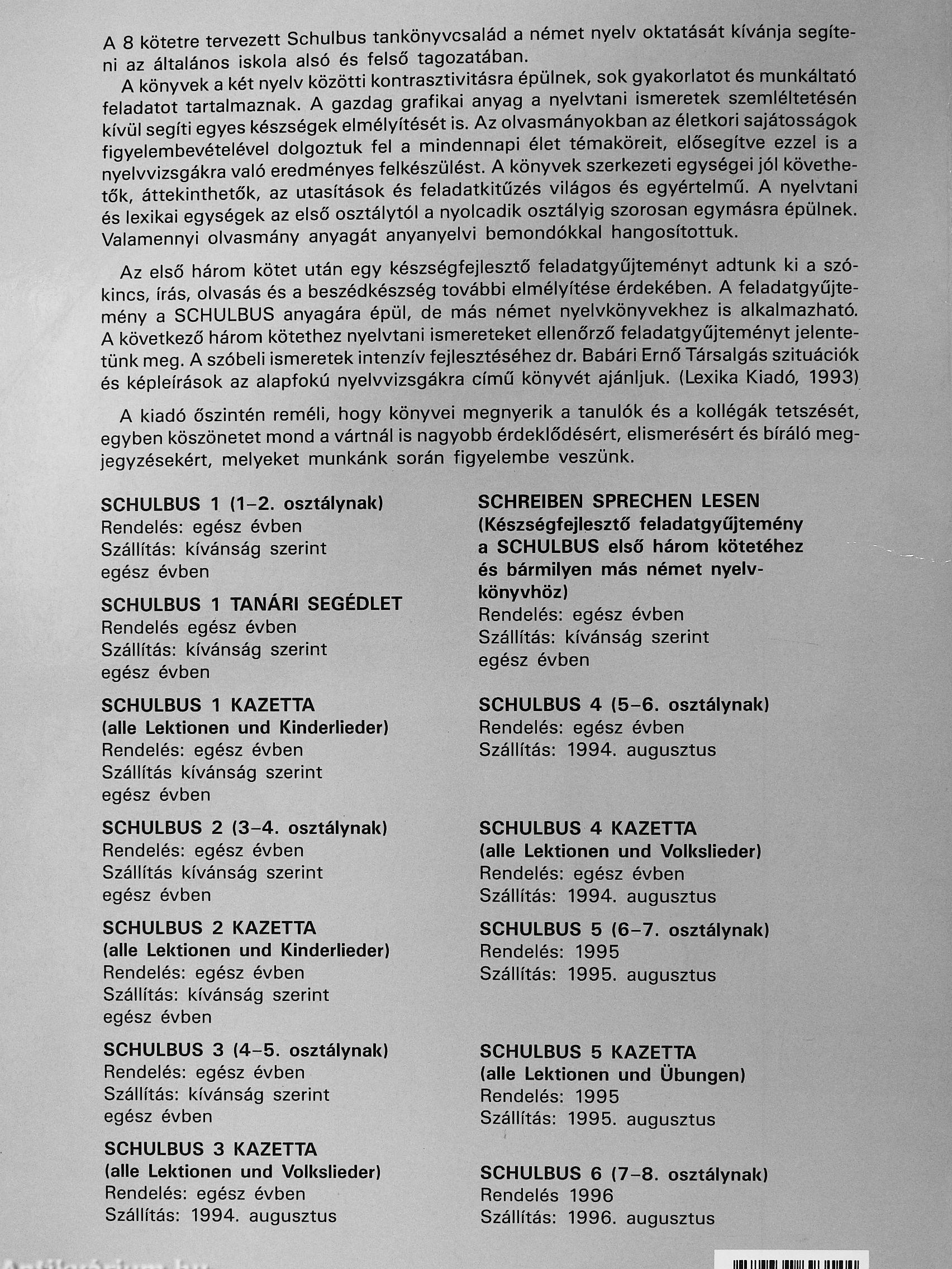 Az első három kötet után egy készségfejlesztő feladatgyűjteményt adtunk ki a szókincs, írás, olvasás és a beszédkészség további elmélyítése érdekében. A feladatgyűjtemény a SCHULBUS anyagára épül, de más német nyelvkönyvekhez Is alkalmazható. A következő három kötethez nyelvtani ismereteket ellenőrző feladatgyűjteményt jelentetünk meg. A szóbeli ismeretek intenzív fejlesztéséhez dr. Babári Ernő Társalgás szituációk és képleírások az alapfokú nyelvvizsgákra című könyvét ajánljuk. (Lexika Kiadó, 1993)