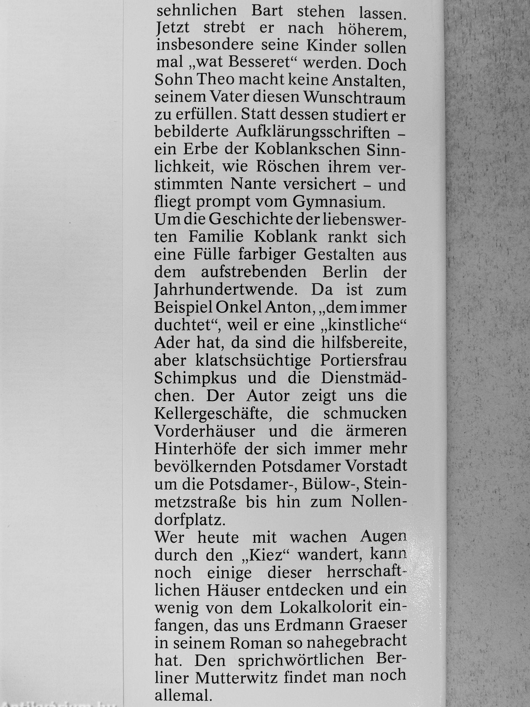 sehnlichen Bart stehen lassen. Jetzt strebt er nach höherem, insbesondere seine Kinder sollen mal „wat Besseret" werden. Doch Sohn Theo macht keine Anstalten, seinem Vater diesen Wunschtraum zu erfüllen. Statt dessen studiert er bebilderte Auflclärungsschriften -ein Erbe der Koblankschen Sinnlichkeit, wie Röschen ihrem verstimmten Nante versichert - und fliegt prompt vom Gymnasium. Um die Geschichte der liebenswerten Familie Koblank rankt sich eine Fülle farbiger Gestalten aus dem aufstrebenden Berlin der Jahrhundertwende. Da ist zum Beispiel Onkel Anton, „dem immer duchtet", weil er eine „kinsthche" Ader hat, da sind die hilfsbereite, aber klatschsüchtige Portiersfrau Schimpkus und die Dienstmädchen. Der Autor zeigt uns die Kellergeschäfte, die schmucken Vorderhäuser und die ärmeren Hinterhöfe der sich immer mehr bevölkernden Potsdamer Vorstadt um die Potsdamer-, Bülow-, Steinmetzstraße bis hin zum Nollendorfplatz.