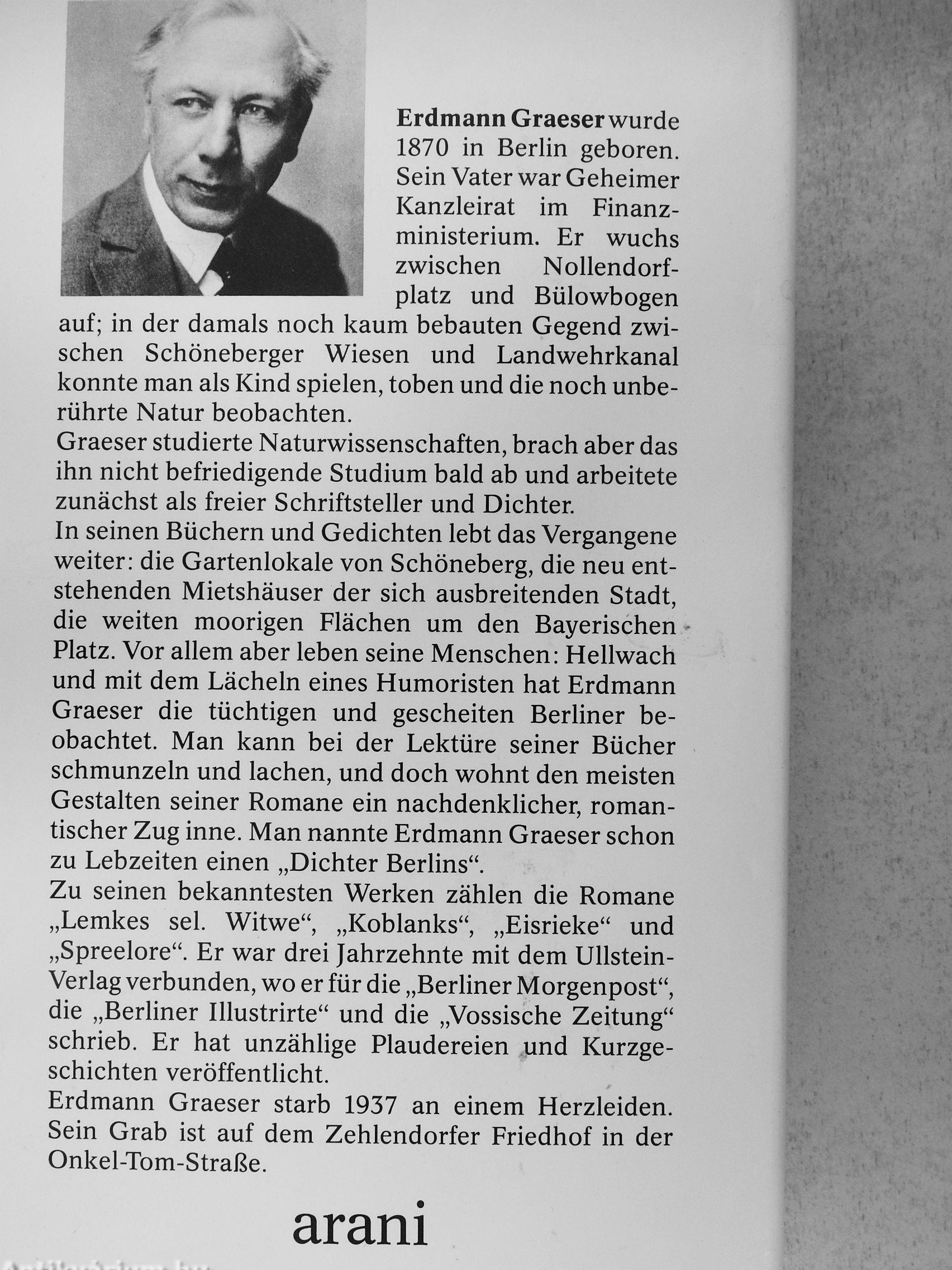 Graeser studierte Naturwissenschaften, brach aber das ihn nicht befriedigende Studium bald ab und arbeitete zunächst als freier Schriftsteller und Dichter. In seinen Büchern und Gedichten lebt das Vergangene weiter: die Gartenlokale von Schöneberg, die neu entstehenden Mietshäuser der sich ausbreitenden Stadt, die weiten moorigen Flächen um den Bayerischen Platz. Vor allem aber leben seine Menschen: Hellwach und mit dem Lächeln eines Humoristen hat Erdmann Graeser die tüchtigen und gescheiten Berliner beobachtet. Man kann bei der Lektüre seiner Bücher schmunzeln und lachen, und doch wohnt den meisten Gestalten seiner Romane ein nachdenklicher, romantischer Zug inne. Man nannte Erdmann Graeser schon zu Lebzeiten einen „Dichter Berlins". Zu seinen bekanntesten Werken zählen die Romane „Lemkes sei. Witwe", „Koblanks", „Eisrieke" und „Spreelore". Er war drei Jahrzehnte mit dem Ullstein-Verlag verbunden, wo er für die „Berliner Morgenpost", die „Berliner Illustrirte" und die „Vossische Zeitung" schrieb. Er hat unzählige Plaudereien und Kurzgeschichten veröffentlicht.