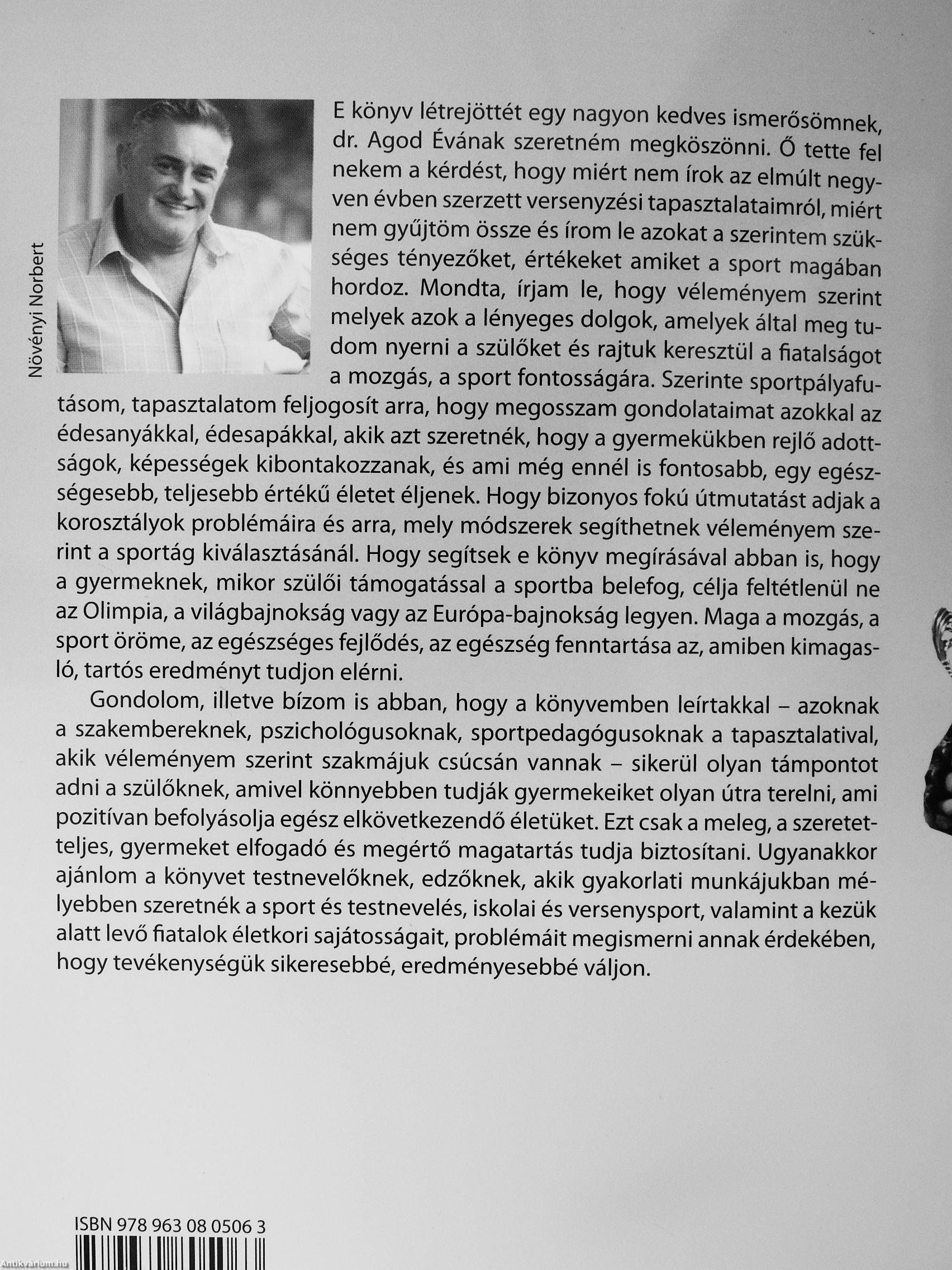 E könyv létrejöttét egy nagyon kedves ismerősömnek, dr. Agod Évának szeretném megköszönni. Ö tette fel nekem a kérdést, hogy miért nem írok az elmúlt negyven évben szerzett versenyzési tapasztalataimról, miért nem gyűjtöm össze és írom le azokat a szerintem szükséges tényezőket, értékeket amiket a sport magában hordoz. Mondta, írjam le, hogy véleményem szerint melyek azok a lényeges dolgok, amelyek által meg tudom nyerni a szülőket és rajtuk keresztül a fiatalságot a mozgás, a sport fontosságára. Szerinte sportpályafutásom, tapasztalatom feljogosít arra, hogy megosszam gondolataimat azokkal az édesanyákkal, édesapákkal, akik azt szeretnék, hogy a gyermekükben rejlő adottságok, képességek kibontakozzanak, és ami még ennél is fontosabb, egy egészségesebb, teljesebb értékű életet éljenek. Hogy bizonyos fokú útmutatást adjak a korosztályok problémáira és arra, mely módszerek segíthetnek véleményem szerint a sportág kiválasztásánál. Hogy segítsek e könyv megírásával abban is, hogy a...