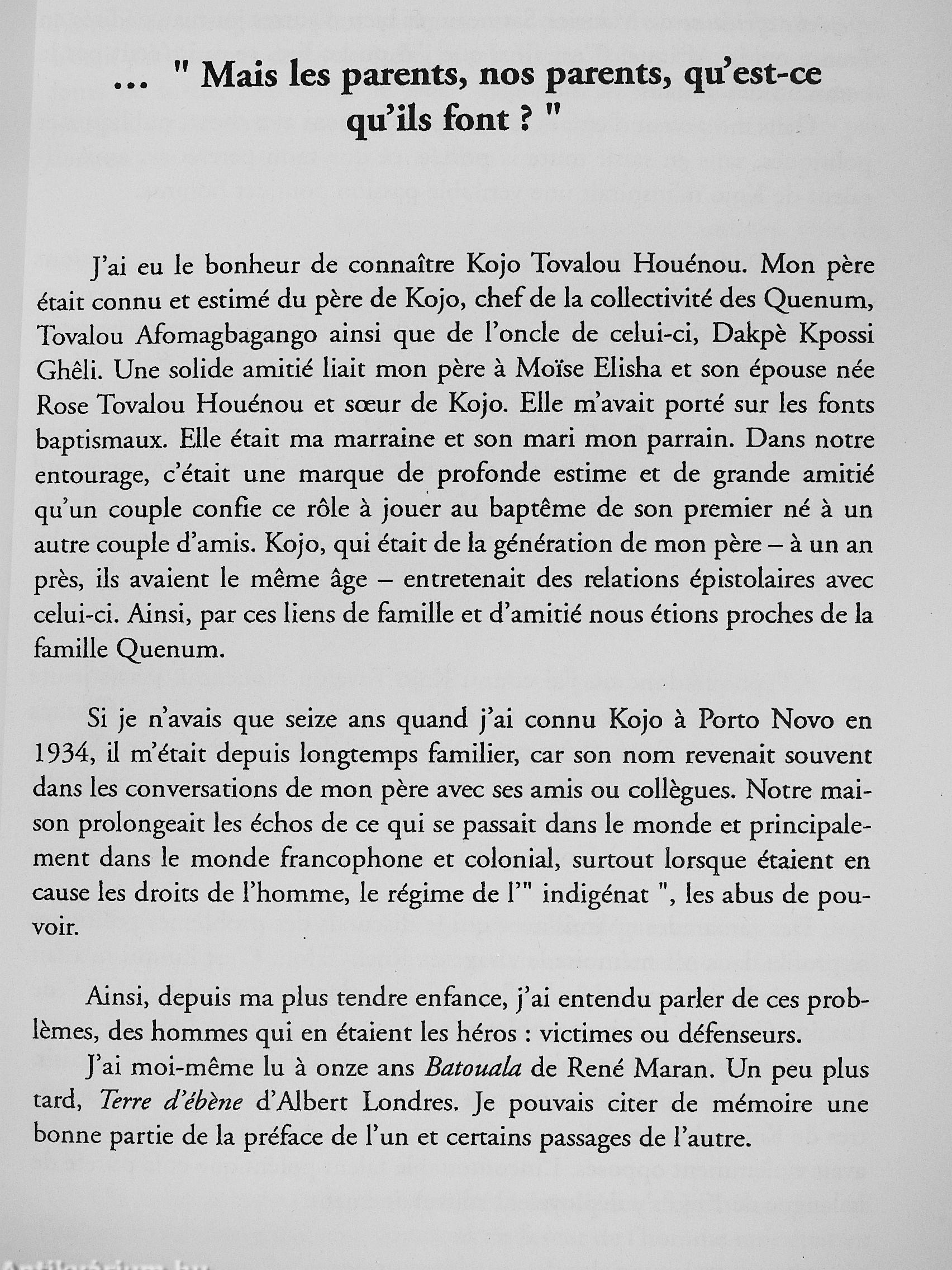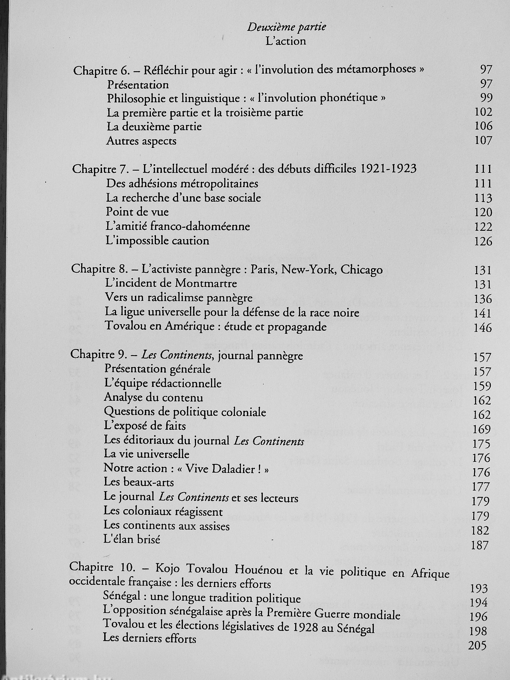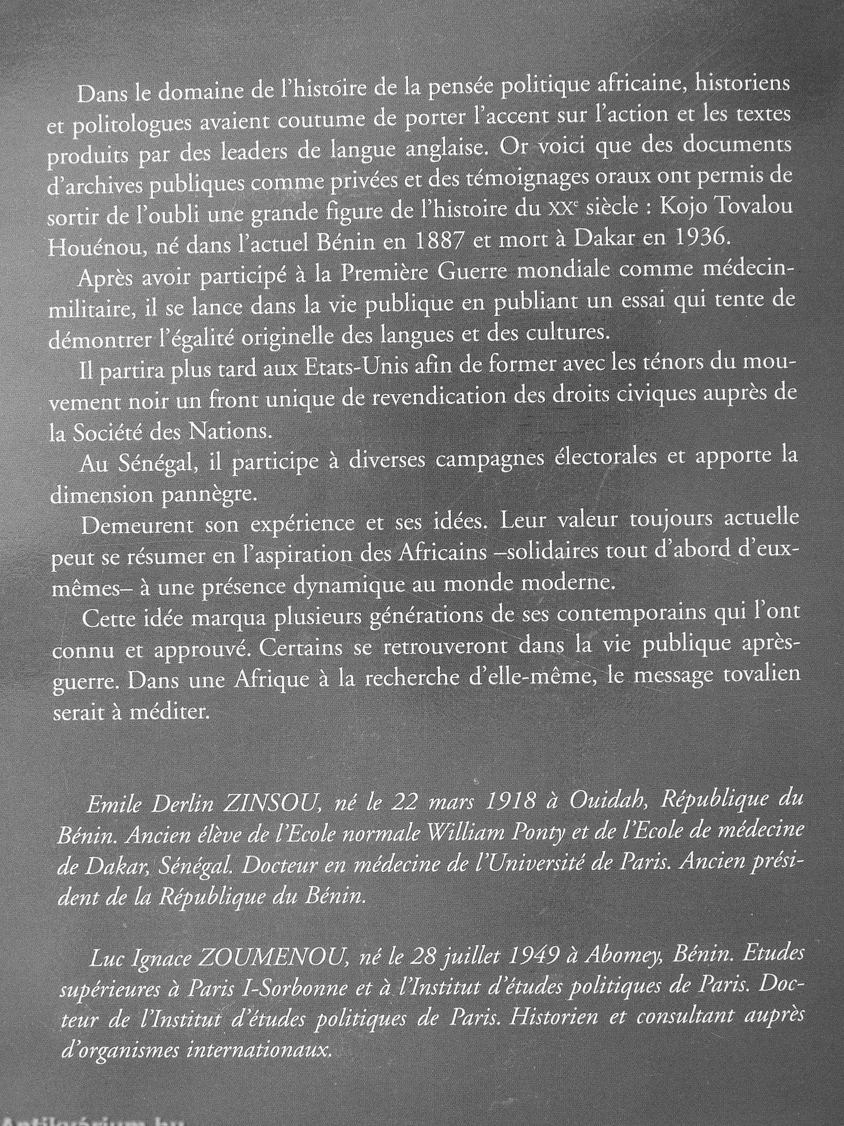 Dans le domaine de l'histoire de la pensée politique africaine, historiens et politologues avaient coutume de porter l'accent sur l'action et les textes produits par des leaders de langue anglaise. Or voici que des documents d'archives publiques comme privées et des témoignages oraux ont permis de sortir de l'oubli une grande figure de l'histoire du XX' siecle : Kojo Tovalou Houénou, né dans l'actuel Bénin en 1887 et mort a Dakar en 1936.