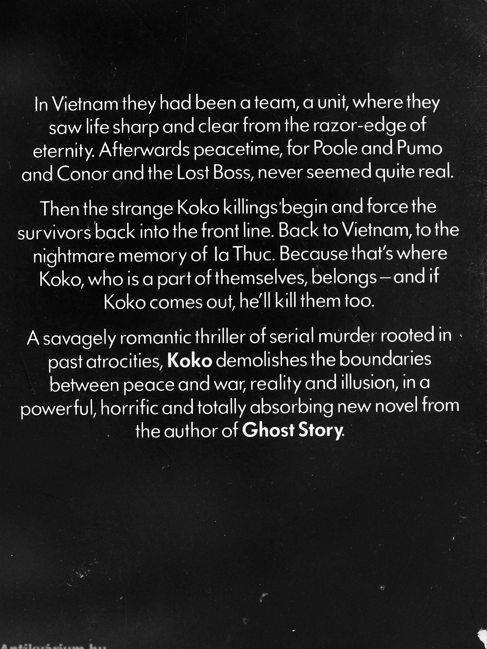 Asavagely romantic thriller of serial murder rooted in ^ post atrocities, Koko demolishes the boundaries Detween peace and war, reality and illusion, in a powerful, horrific and totally absorbing new novel from the author of Ghost Story.