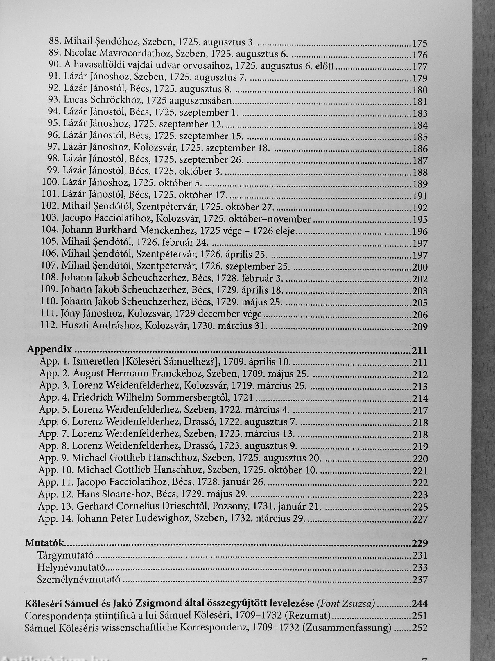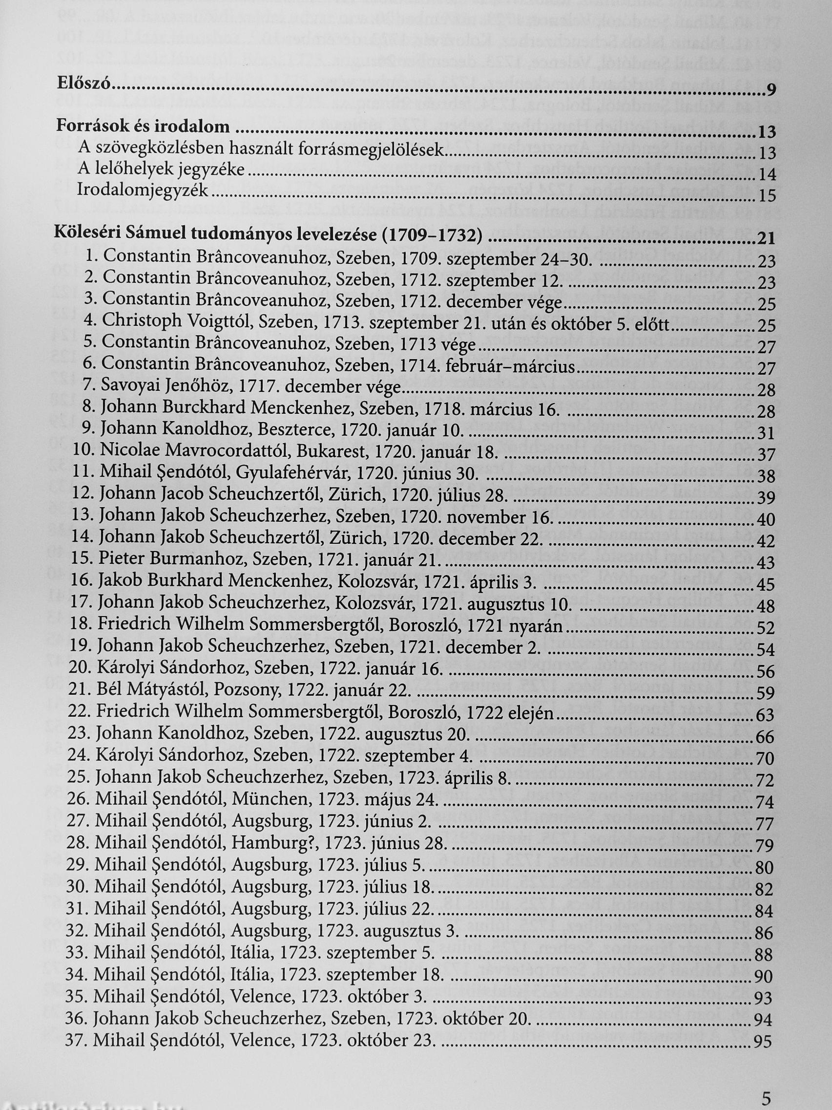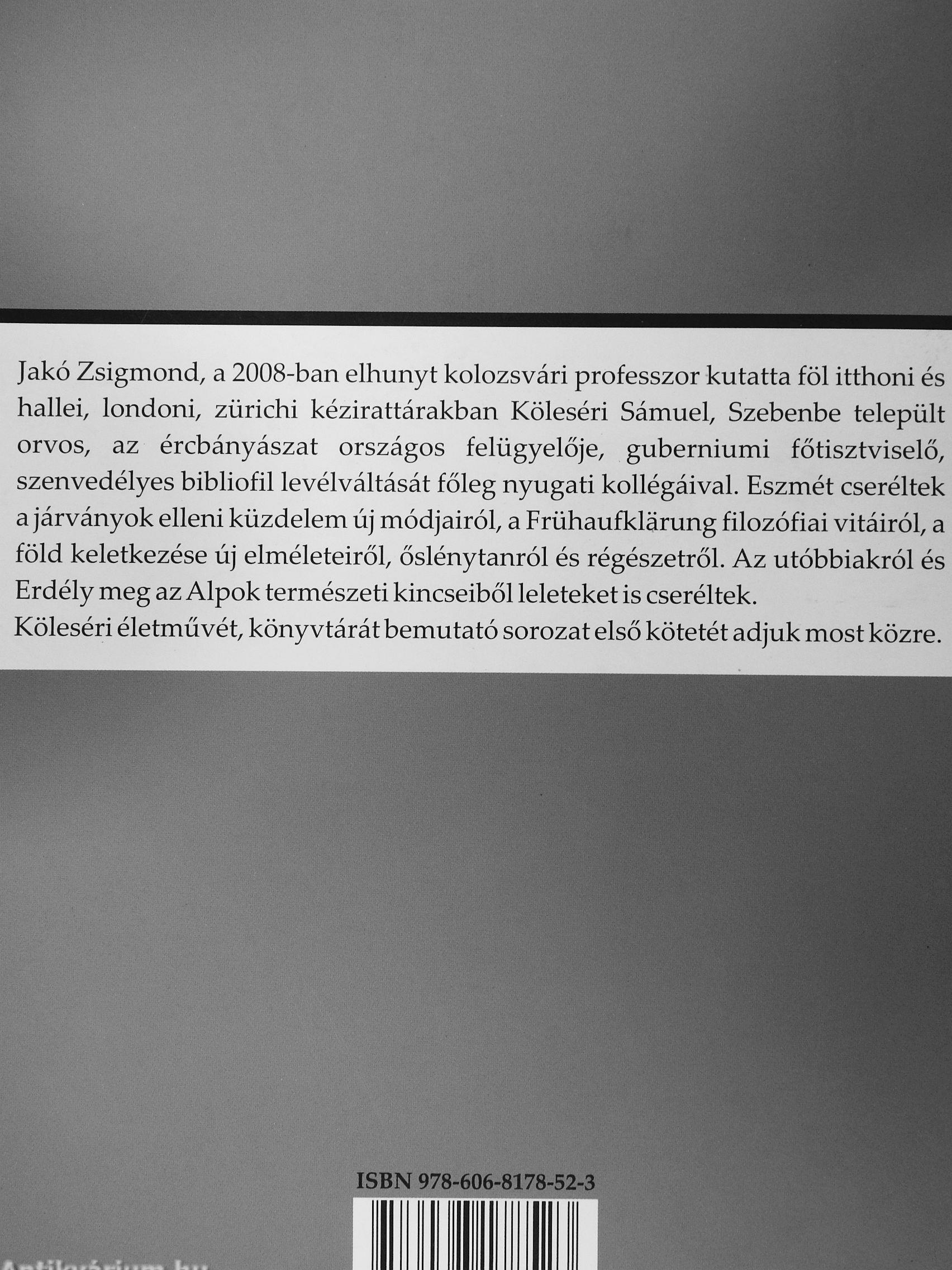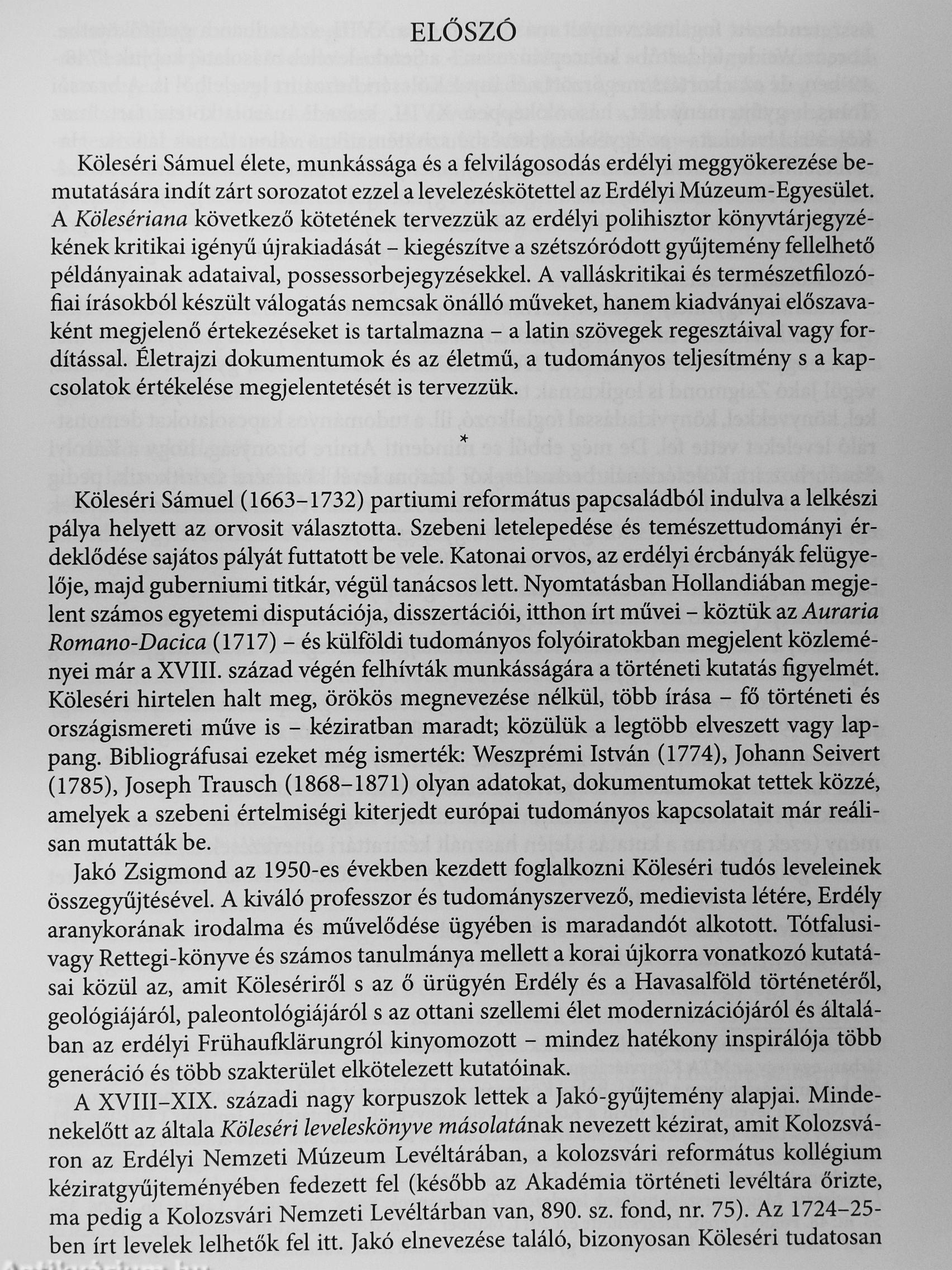 Jakó Zsigmond, a 2008-ban eliiunyt kolozsvári professzor kutatta föl itthoni és hallei, londoni, zürichi kézirattárakban Köleséri Sámuel, Szebenbe települt orvos, az ércbányászat országos felügyelője, guberniumi főtisztviselő, szenvedélyes bibliofil levélváltását főleg nyugati kollégáival. Eszmét cseréltek a járványok elleni küzdelem új módjairól, a Frühaufklárung filozófiai vitáiról, a föld keletkezése új elméleteiről, őslénytanról és régészetről. Az utóbbiakról és Erdély meg az Alpok természeti kincseiből leleteket is cseréltek. Köleséri életművét, könyvtárát bemutató sorozat első kötetét adjuk most közre.