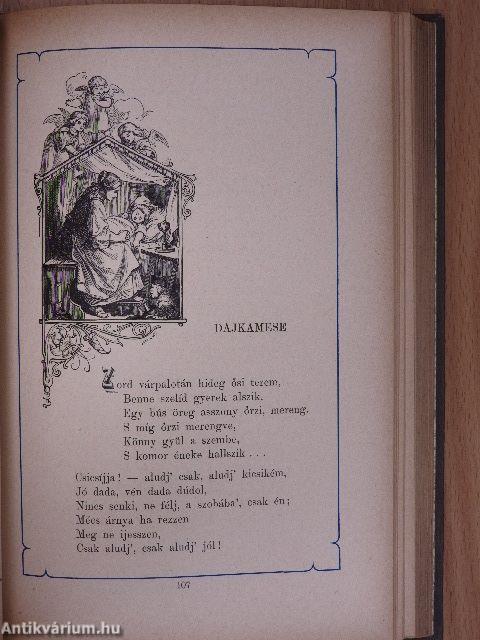 | Megjegyzés: | Aranyozott, festett kiadói egészvászon-kötésben. Az eredeti rajzok Greguss János, Aggházy Gyula, Gyulai László, Greguss Imre s többiektől valók. Metszette Morelli Gusztáv. Bekeretezett oldalak, a címlap előtt egy színes kép és számos szövegközti rajz díszítik a könyvet. Készítette Rudnyánszky A. könyvnyomdája, Budapesten. |
