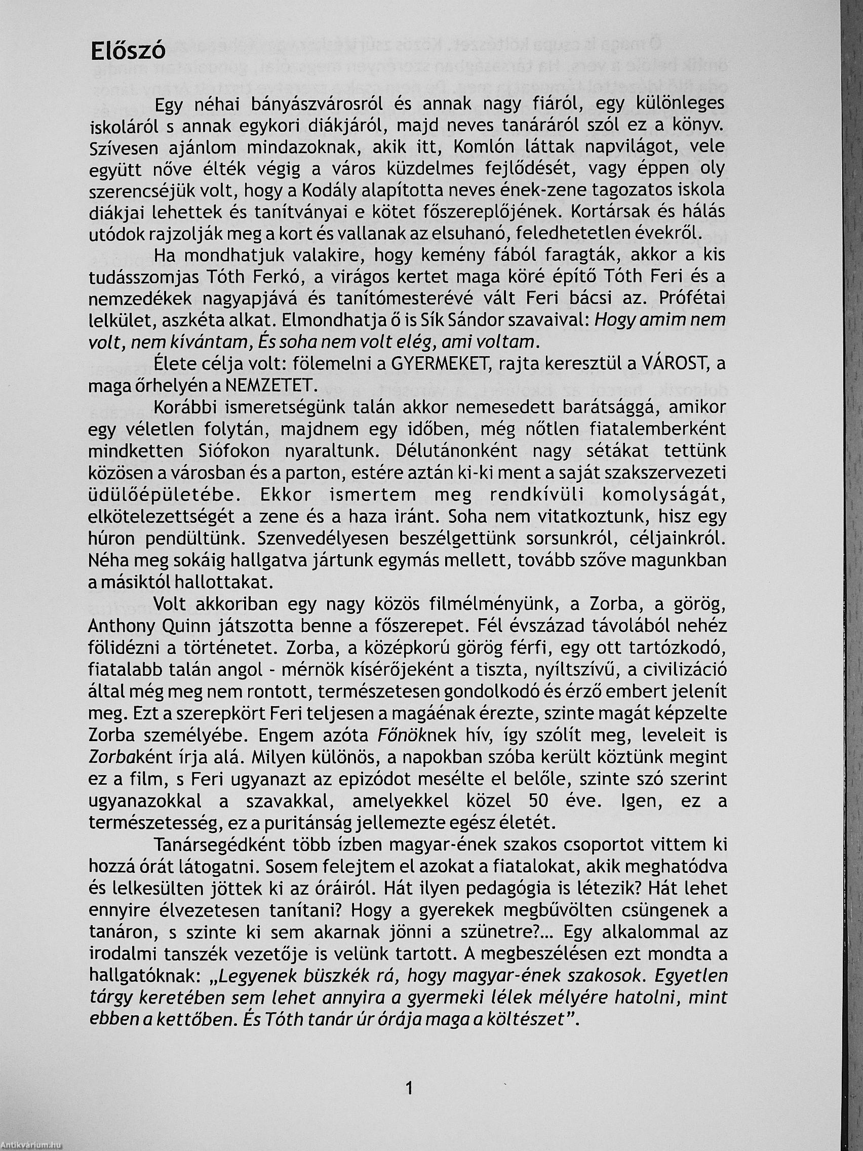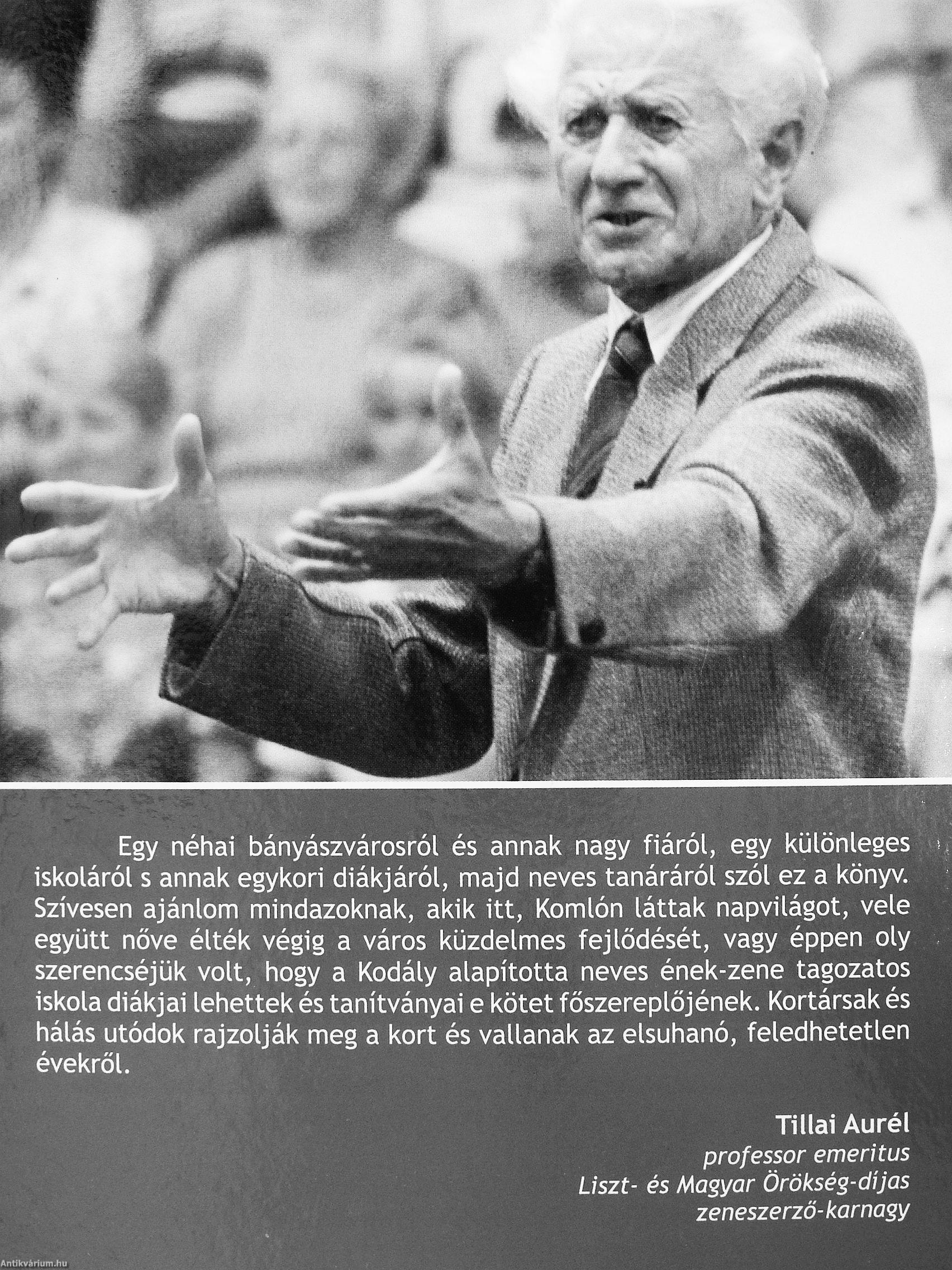 Egy néhai bányászvárosról és annak nagy fiáról, egy különleges iskoláról s annak egykori diákjáról, majd neves tanáráról szól ez a könyv. Szívesen ajánlom mindazoknak, akik itt. Komlón láttak napvilágot, vele együtt nőve élték végig a város küzdelmes fejlődését, vagy éppen oly szerencséjük volt, hogy a Kodály alapította neves ének-zene tagozatos iskola diákjai lehettek és tanítványai e kötet főszereplőjének. Kortársak és hálás utódok rajzolják meg a kort és vallanak az elsuhanó, feledhetetlen évekről.