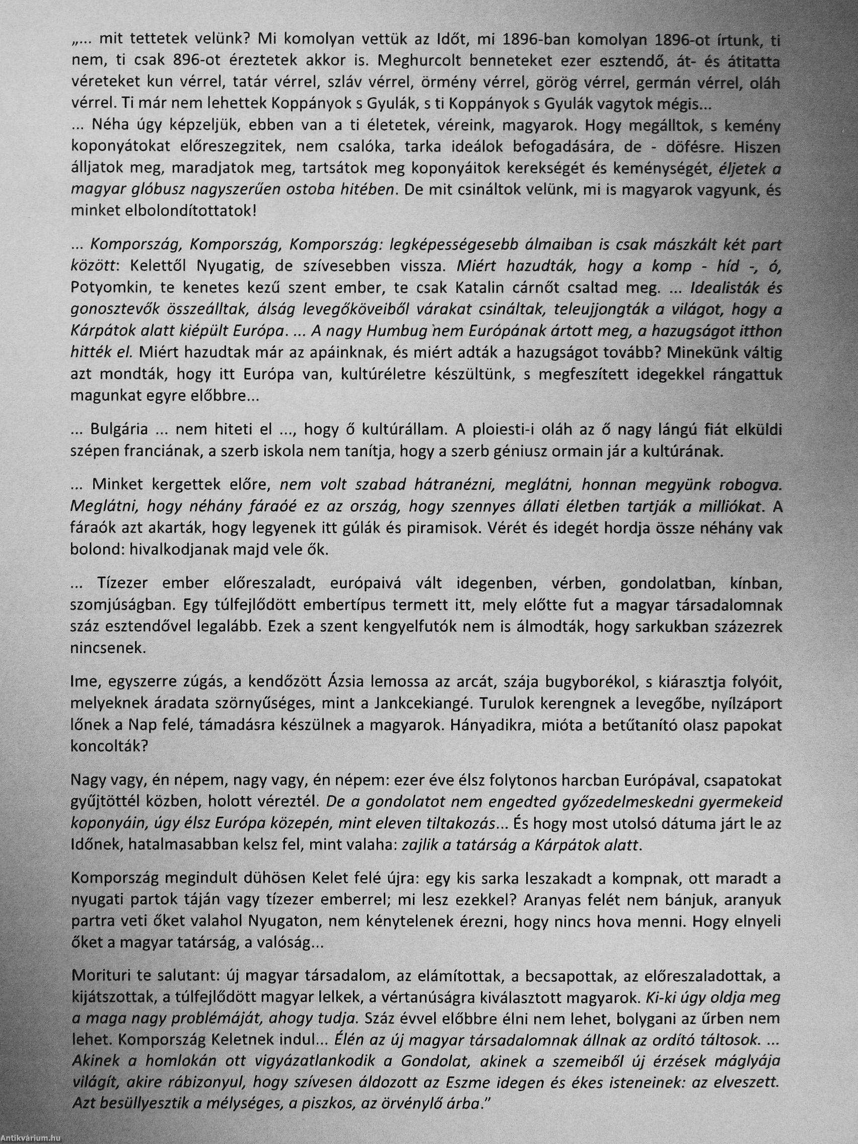 mit tettetek velünk? Mi komolyan vettük az Időt, ml 1896-ban komolyan 1896-ot írtunk, ti nem, ti csak 896-ot éreztetek akkor is. Meghurcolt benneteket ezer esztendő, át- és átitatta véreteket kun vérrel, tatár vérrel, szláv vérrel, örmény vérrel, görög vérrel, germán vérrel, oláh vérrel. Ti már nem lehettek Koppányok s Gyulák, s ti Koppányok s Gyulák vagytok mégis Néha úgy képzeljük, ebben van a ti életetek, véreink, magyarok. Hogy megálltok, s kemény koponyátokat elöreszegzitek, nem csalóka, tarka ideálok befogadására, de - döfésre. Hiszen álljatok meg, maradjatok meg, tartsátok meg koponyáitok kerekségét és keménységét, éljetek a magyar glóbusz riagyszerűer) ostoba hitében. De mit csináltok velünk, mi is magyarok vagyunk, és minket elbolondítottatokl