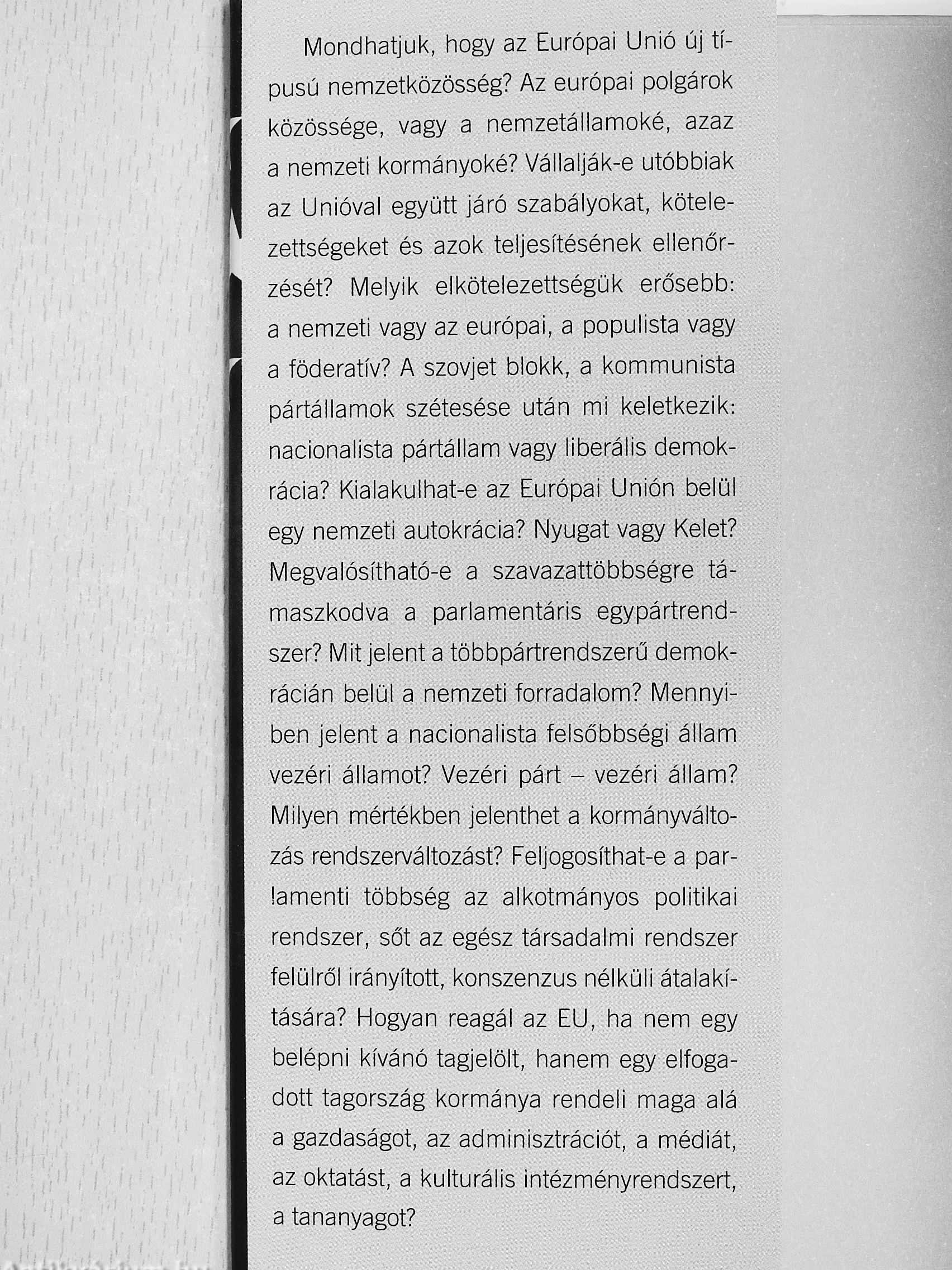 Mondhatjuk, hogy az Európai Unió új típusú nemzetközösség? Az európai polgárok közössége, vagy a nemzetállamoké, azaz a nemzeti kormányoké? Vállalják-e utóbbiak az Unióval együtt járó szabályokat, kötelezettségeket és azok teljesítésének ellenőrzését? Melyik elkötelezettségük erősebb: a nemzeti vagy az európai, a populista vagy a föderatív? A szovjet blokk, a kommunista pártállamok szétesése után mi keletkezik: nacionalista pártállam vagy liberális demokrácia? Kialakuihat-e az Európai Unión belül egy nemzeti autokrácia? Nyugat vagy Kelet? Megvalósítható-e a szavazattöbbségre támaszkodva a parlamentáris egypártrendszer? Mltjeient a többpártrendszerű demokrácián belül a nemzeti forradalom? Mennyiben jelent a nacionalista felsőbbség! állam vezéri államot? Vezéri párt - vezéri állam? Milyen mértékben jelenthet a kormányváltozás rendszerváltozást? Feljogosíthat-e a parlamenti többség az alkotmányos politikai rendszer, sőt az egész társadalmi rendszer felülről irányított, konszenzus nélküli átalakítására? Hogyan reagál az EU, ha nem egy belépni kívánó tagjelölt, hanem egy elfogadott tagország kormánya rendeli maga alá a gazdaságot, az adminisztrációt, a médiát, az oktatást, a kulturális intézményrendszert, a tananyagot? Vissza