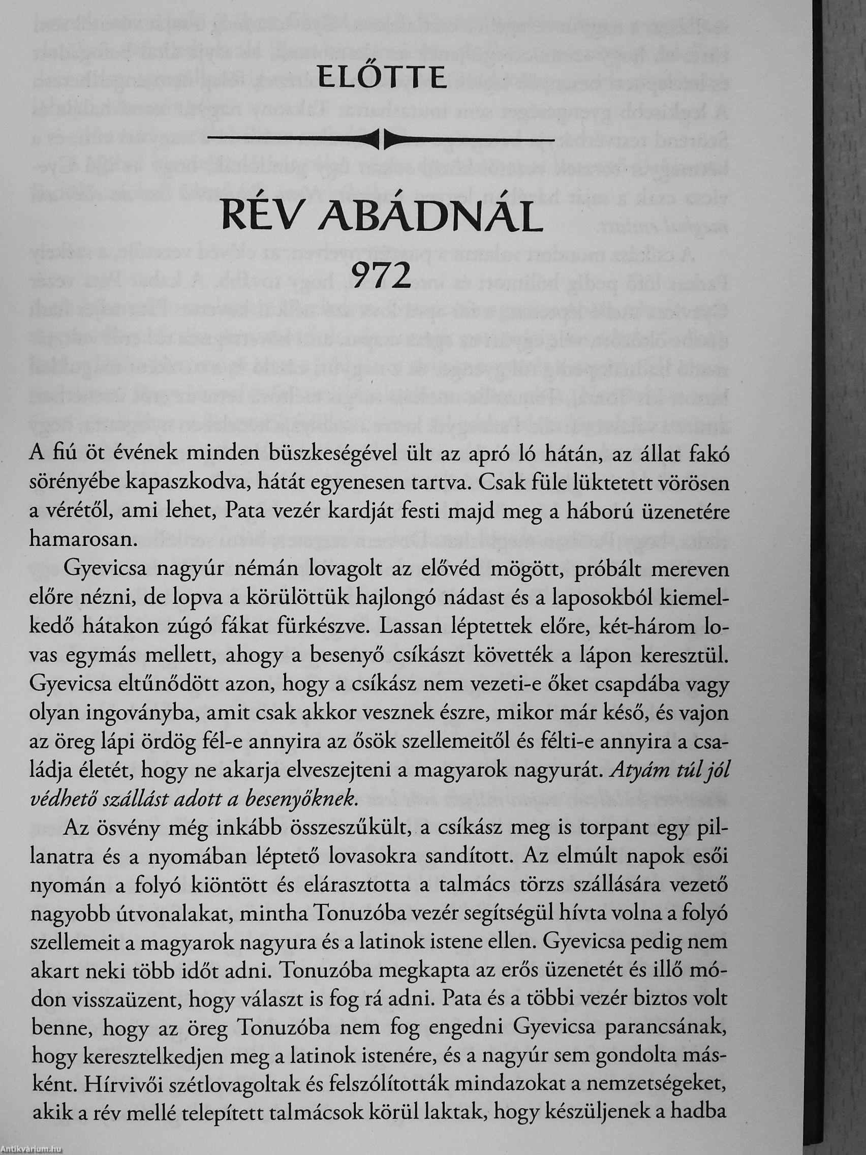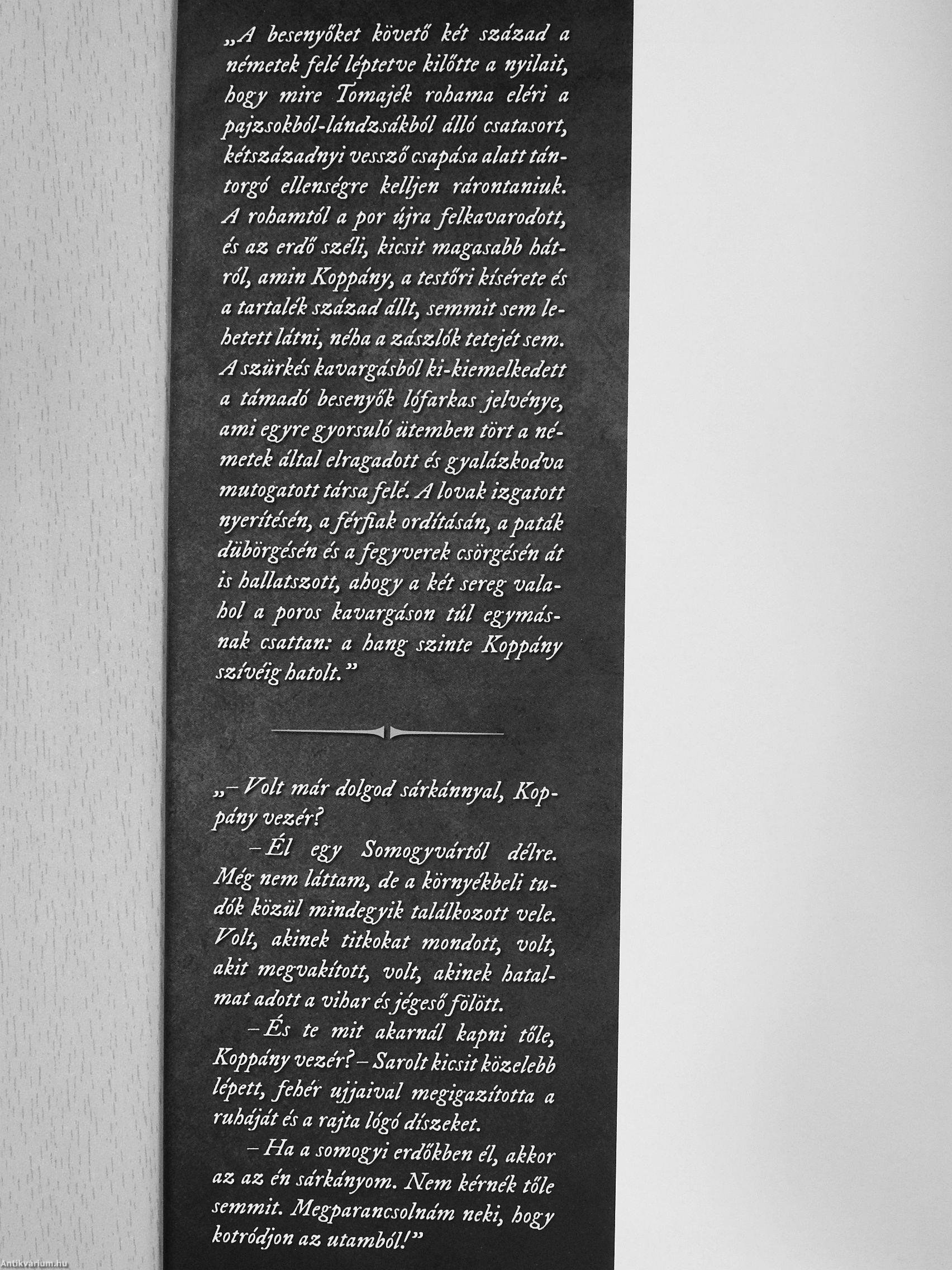 „A besenyőket követő két század a németek felé léptetve kilőtte a nyilait, ho^ mire Tomajék rohama eléri a pajzsokhól-ldndzsdkból álló csatasort, kétszázadnyi vessző csapása alatt tántorgó ellenségre kelljen rárontaniuk. A rohamtól a por újra felkavarodott, és az erdő széli, kicsit magasabb hátról, amin Koppány, a testőri kísérete és a tartalék század dllt, semmit sem lehetett látni, néha a zászlók tetejét sem. A szürkés kavargásból ki-kiemelkedett a támadó besenyők lófarkas jelvénye, ami egyre gyorsuló ütemben tört a németek által elragadott és gyalázkodva mutogatott társa felé. A lovak izgatott nyerítés én, a férfiak ordításán, a paták dübörgésén és a fegyverek csörgésén át is hallatszott, ahogy a két sereg valahol a poros kavargáson tál egymásnak csattan: a hang szinte Koppány szívéig hatolt."