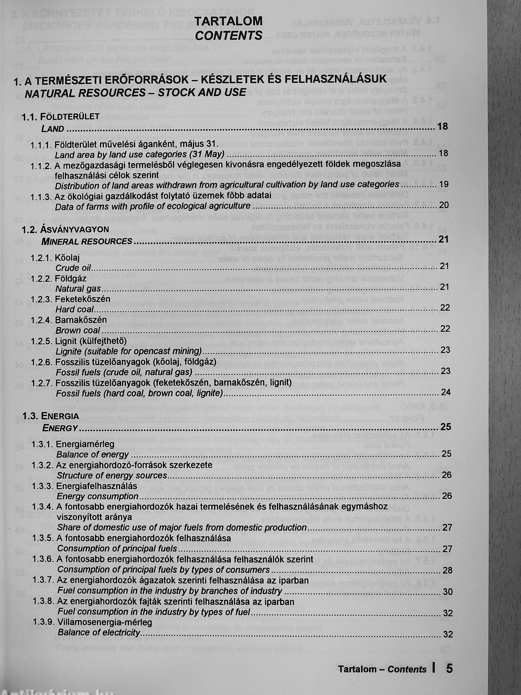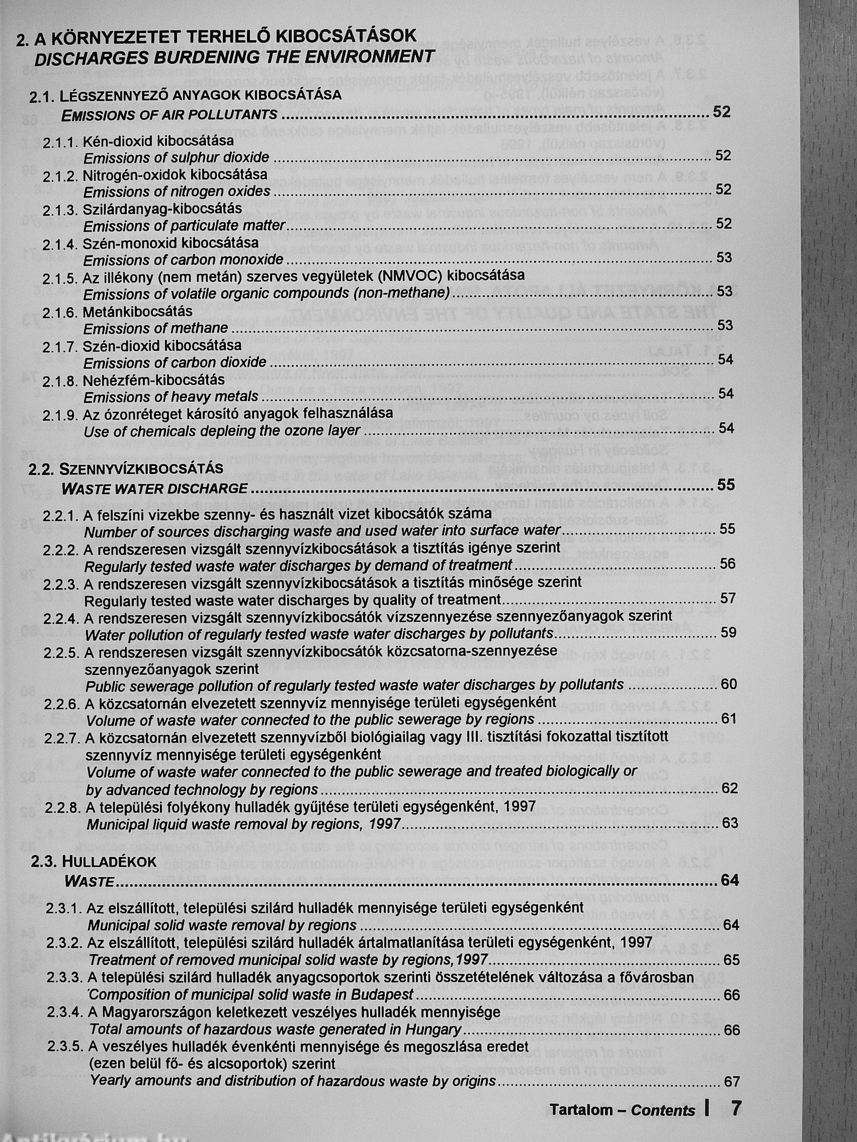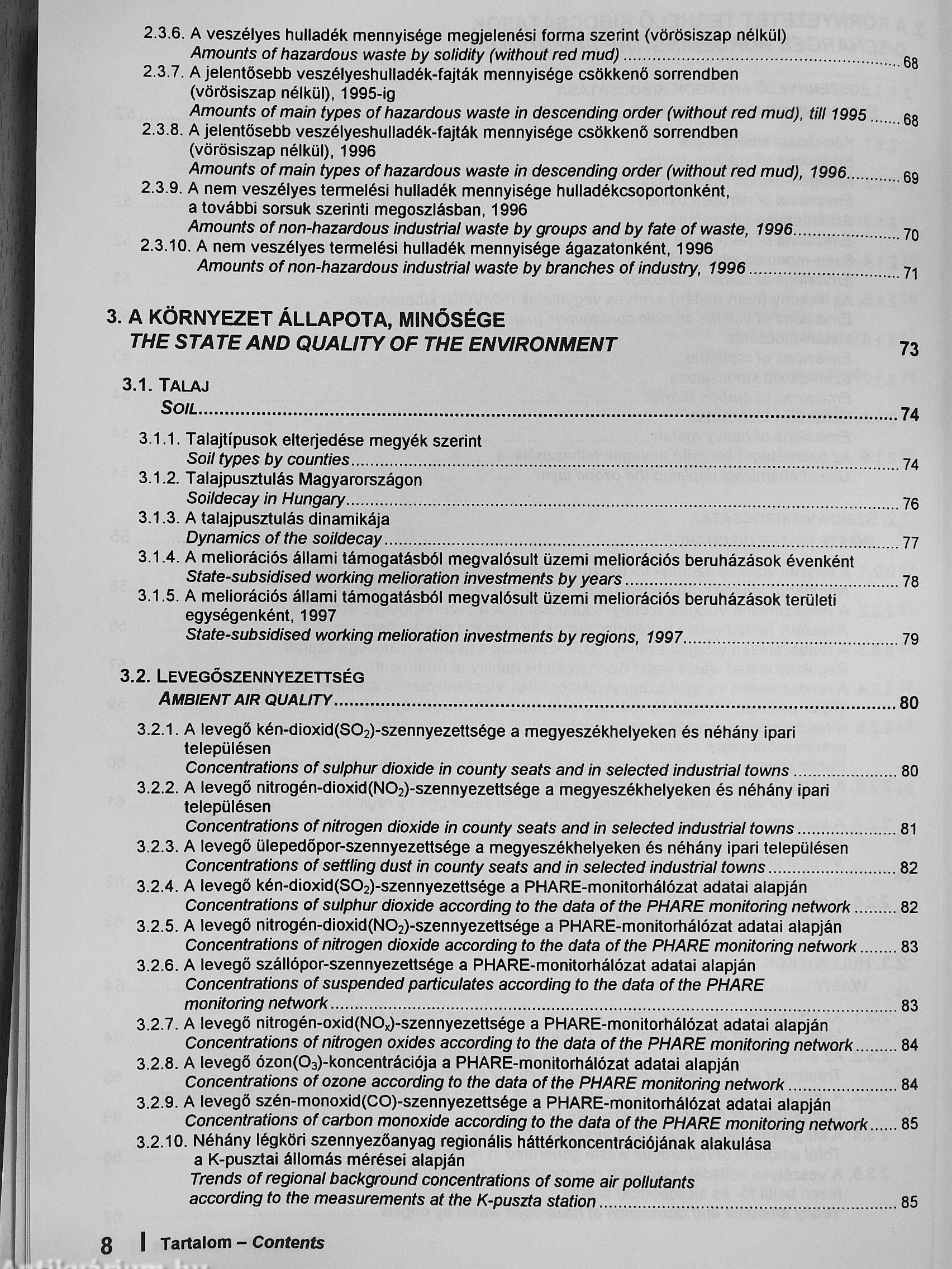 A tartalomból: földterület, ásványvagyon, energia, vízkészletek, vízhasználat, erdő; légszennyező anyagok kibocsátása, szennyvízkibocsátás, hulladékok; talaj, levegőszennyezettség, vízminőség, élővilág, környezet-egészségügy, települési