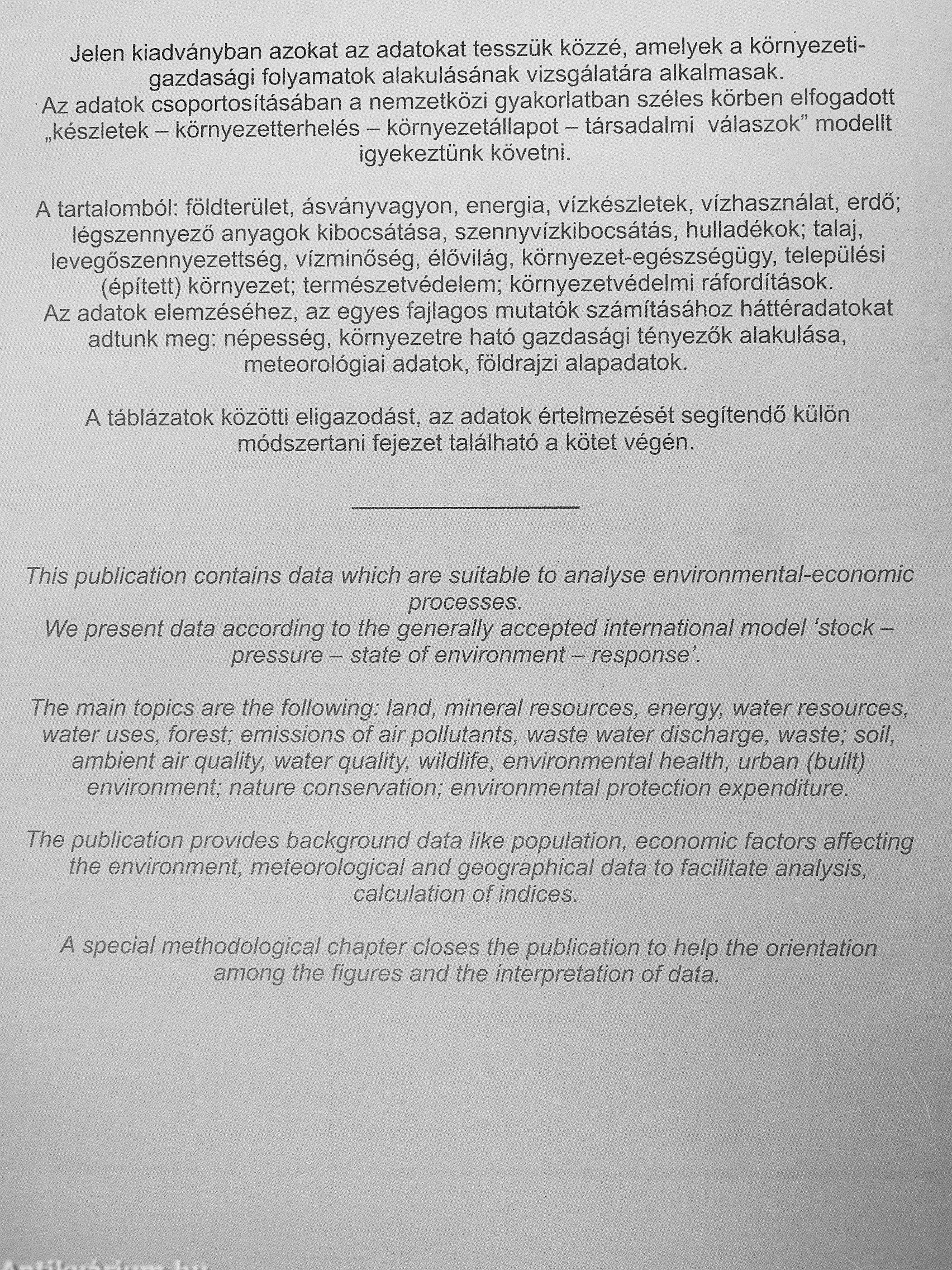 Jelen kiadványban azokat az adatokat tesszük közzé, amelyek a környezetigazdasági folyamatok alakulásának vizsgálatára alkalmasak. Az adatok csoportosításában a nemzetközi gyakorlatban széles körben elfogadott „készletek - környezetterhelés - környezetállapot - társadalmi válaszok" modellt