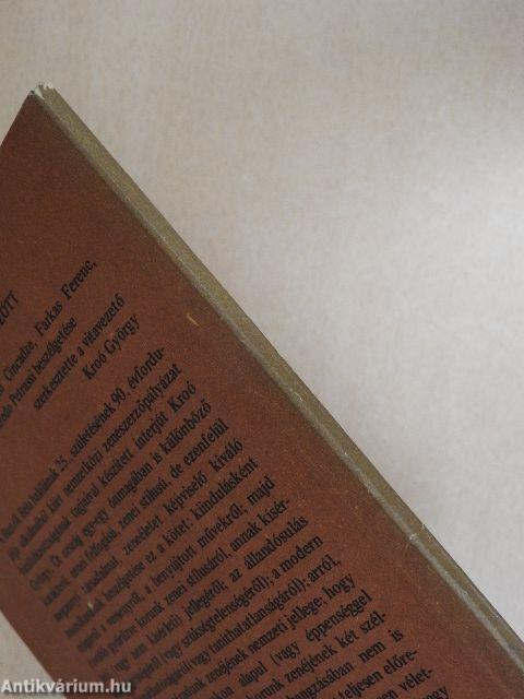 A Bartók Béla halálának 25., születésének 90. évfordulója alkalmából kiírt nemzetközi zeneszerzőpályázat bírálóbizottságának tagjaival készített interjút Kroó György. Öt ország egy-egy önmagában is különböző karakterű, zenei felfogású, zenei stílusú, de ezenfelül megannyi társadalmat, zeneéletet képviselő kiváló muzsikusának beszélgetése ez a kötet: kiindulásként magáról a versenyről, a benyújtott művekről; majd tovább gyűrűzve korunk zenei stílusáról, annak kísérleti (vagy nem kísérleti) jellegéről; az állandósulás szükségességéről (vagy szükségtelenségéről); a modern zene taníthatóságáról (vagy taníthatatlanságáról); arról, hogy van-e századunk zenéjének nemzeti jellege, hogy milyen hagyományokon alapul (vagy éppenséggel a hagyományok hiányán) korunk zenéjének két szélsőséges (vagy eredményében, hangzásában nem is olyan szélsőséges-ellentétes) irányzata, a teljesen előrerendelt, megszerkesztett szeriális, és a teljesen véletlenszerű aleatorikus zene; az érzelem harcáról (vagy egyensúlyáról) századunk zenéjében. Ezekről és hasonló égető kérdésekről folyt a beszélgetés (és szól a Zeneélet-sorozat e legújabb kötete) - kortárs zeneszerzők között.