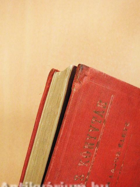 A gerinc vászonnal pótolt, a kötés megtört. A borító foltos és kopott. Néhány lap foltos.