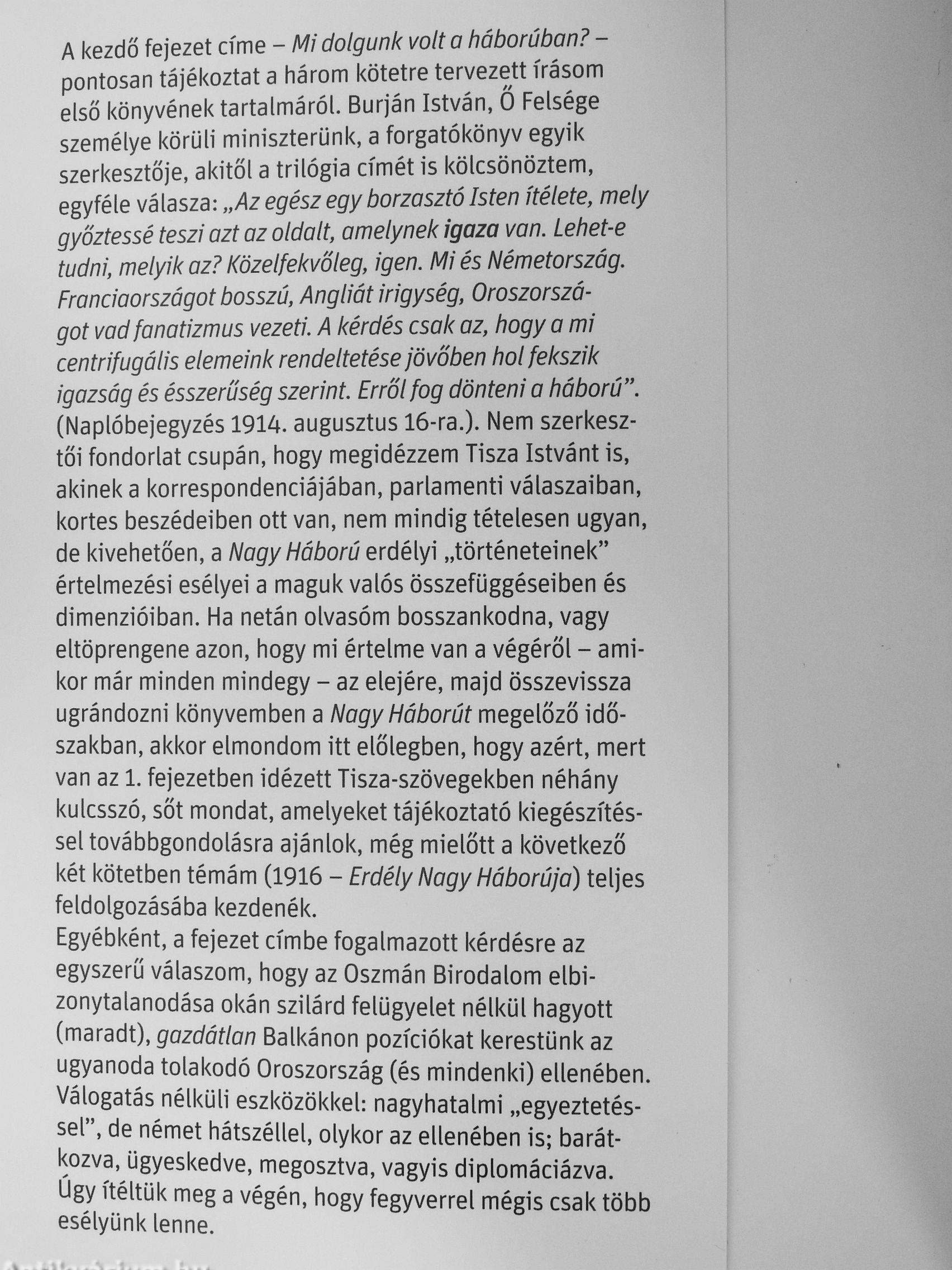 A kezdő fejezet címe - Mi dolgunk volt a háborúban? -pontosan tájékoztat a három kötetre tervezett írásom elsö könyvének tartalmáról. Burján István, Ö Felsége személye körüli miniszterünk, a forgatókönyv egyik szerkesztője, akitől a trilógia címét is kölcsönöztem, egyféle válasza: „Az egész egy borzasztó Isten ítélete, mely győztessé teszi azt az oldalt, amelynek igaza van. Lehet-e tudni, melyik az? Közelfekvőleg, igen. Mi és Németország. Franciaországot bosszú, Angliát irigység, Oroszországot vad fanatizmus vezeti. A kérdés csak az, hogy a mi centrifugális elemeink rendeltetése jövőben hol fel<szik igazság és ésszerűség szerint. Erről fog dönteni a háború". (Naplóbejegyzés 1914. augusztus 16-ra.). Nem szerkesztői fondorlat csupán, hogy megidézzem Tisza Istvánt is, akinek a korrespondenciájában, parlamenti válaszaiban, kortes beszédeiben ott van, nem mindig tételesen ugyan, de kivehetően, a Nagy Háború erdélyi „történeteinek" értelmezési esélyei a maguk valós összefüggéseiben és dimenzióiban. Ha netán olvasóm bosszankodna, vagy eltöprengene azon, hogy mi értelme van a végéről - amikor már minden mindegy - az elejére, majd összevissza ugrándozni könyvemben a Nagy Háborút megelőző időszakban, akkor elmondom itt előlegben, hogy azért, mert van az 1. fejezetben idézett Tisza-szövegekben néhány kulcsszó, sőt mondat, amelyeket tájékoztató kiegészítéssel továbbgondolásra ajánlok, még mielőtt a következő két kötetben témám (1916 - Erdély Nagy Háborúja) teljes feldolgozásába kezdenék.