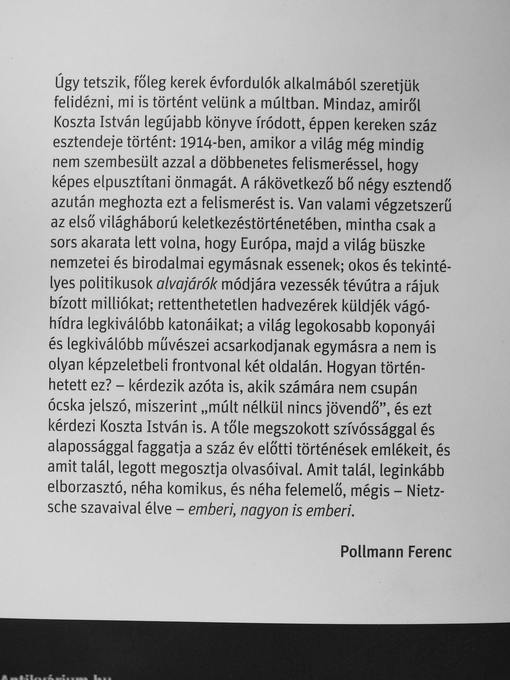 úgy tetszik, főleg kerek évfordulók alkalmából szeretjük felidézni, mi is történt velünk a múltban. Mindaz, amiről Koszta István legújabb könyve íródott, éppen kereken száz esztendeje történt: 1914-ben, amikor a világ még mindig nem szembesült azzal a döbbenetes felismeréssel, hogy képes elpusztítani önmagát. A rákövetkező bő négy esztendő azután meghozta ezt a felismerést is. Van valami végzetszerű az első világháború keletkezéstörténetében, mintha csak a sors akarata lett volna, hogy Európa, majd a világ büszke nemzetei és birodaimai egymásnak essenek; okos és tekintélyes politikusok alvajárók módjára vezessék tévútra a rájuk bízott milliókat; rettenthetetlen hadvezérek küldjék vágóhídra legkiválóbb katonáikat; a világ legokosabb koponyái és legkiválóbb művészei acsarkodjanak egymásra a nem is olyan képzeletbeli frontvonal két oldalán. Hogyan történhetett ez? - kérdezik azóta is, akik számára nem csupán ócska jelszó, miszerint „múlt nélkül nincs jövendő", és ezt kérdezi Koszta István is. A tőle megszokott szívóssággal és alapossággal faggatja a száz év előtti történések emlékeit, és amit talál, legott megosztja olvasóival. Amit talál, leginkább elborzasztó, néha komikus, és néha felemelő, mégis - Nietzsche szavaival élve - emberi, nagyon is emberi.