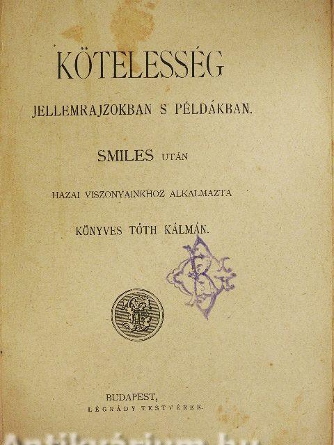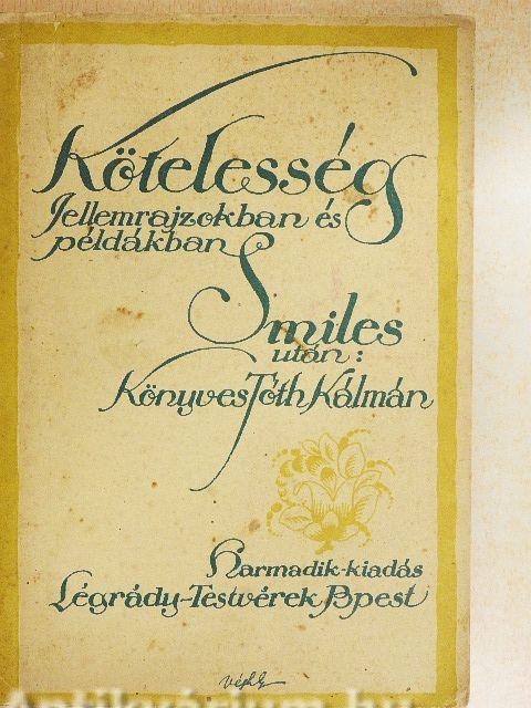 Én is, ki műveit magyarra átültettem, azt óhajtanám, hogy elterjedjenek az ifjuság között ezek a példák, azt óhajtanám, hogy ifjuságunk megtanulná, mi a kötelesség. Uj erénye hadd legyen ez nemzetünknek. Ez az uj erény uj erőt ád s a kik hitet vesztve lankadnak, reményök ismét éledni fog e példák során. Mint Smilesnek elébb megjelent műveiben, ugy ebben is hivatkozom magyar példákra, hogy a könyv ne legyen teljesen idegenszerű, hogy láthassunk édes mieink között is olyanokat, a kiknek nyomdokain haladva teljesíthetjük azt, mit a szent kötelesség méltán követelhet tőlünk.