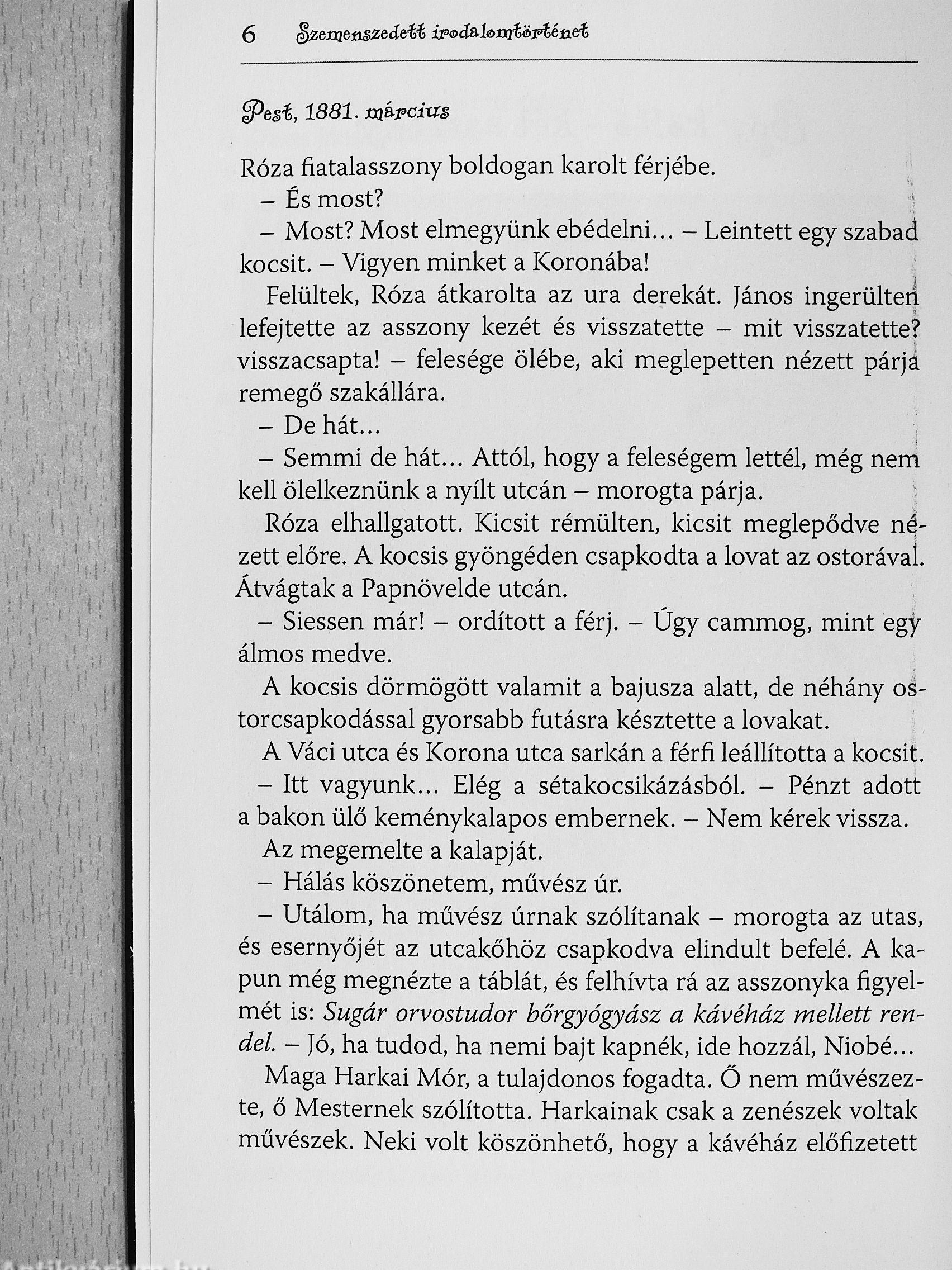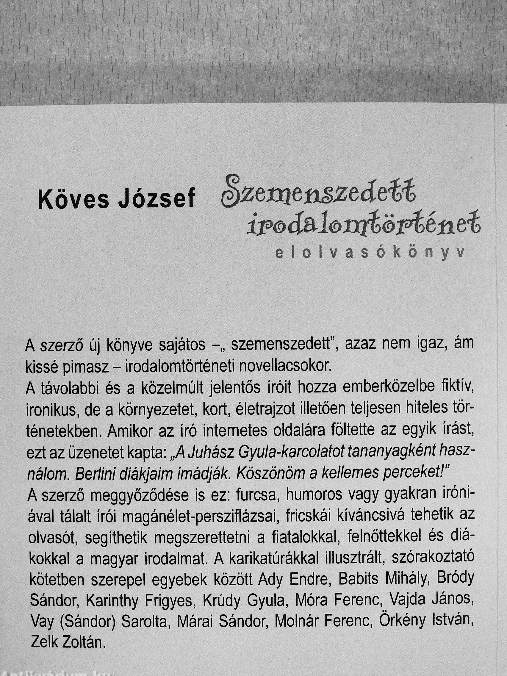 A szerző új könyve sajátos -„ szemenszedett", azaz nem igaz, ám kissé pimasz - irodalomtörténeti novellacsokor. A távolabbi és a közelmúlt jelentős íróit hozza emberközelbe fiktív, ironikus, de a környezetet, kort, életrajzot illetően teljesen hiteles történetekben. Amikor az író internetes oldalára föltette az egyik írást, ezt az üzenetet kapta: „A Juhász Gyula-karcolatot tananyagként használom. Berlini diákjaim imádják. Köszönöm a kellemes perceket!" A szerző meggyőződése is ez: furcsa, humoros vagy gyakran iróniával tálalt írói magánélet-persziflázsai, fricskái kíváncsivá tehetik az olvasót, segíthetik megszerettetni a fiatalokkal, felnőttekkel és diákokkal a magyar irodalmat. A karikatúrákkal illusztrált, szórakoztató kötetben szerepel egyebek között Ady Endre, Babits Mihály, Bródy Sándor, Karinthy Frigyes, Krúdy Gyula, Móra Ferenc, Vajda János, Vay (Sándor) Sarolta, Márai Sándor, Molnár Ferenc, Örkény István, ZeIk Zoltán....