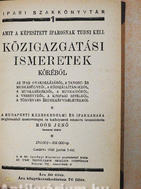 | Megjegyzés: | Lezárva 1941. junius 1-én. Nyomtatta Pallas irodalmi és nyomdai r.-t., Budapest. A Budapesti Kereskedelmi és Iparkamara megbízásából mestervizsgák és tanfolyamok számára összeállította Moor Jenő kamarai titkár. |